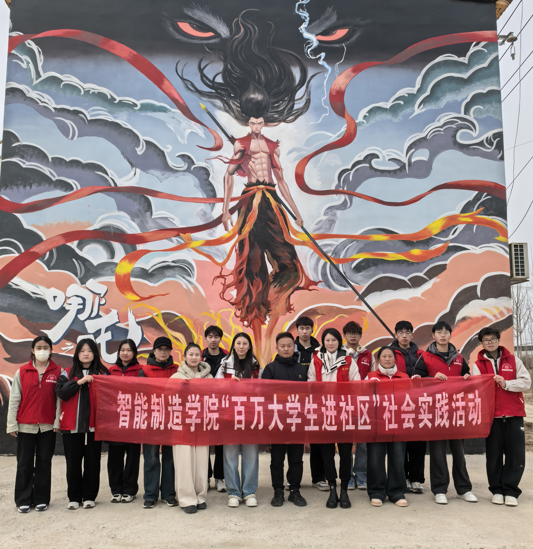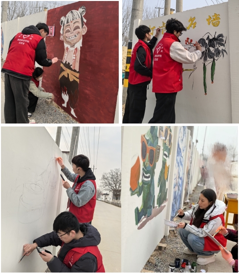 3月15日,聊城职业技术学院学工部创新创业中心副主任吴倩、智能制造学院辅导员郝文晓带领“绿野守护者”宣讲团的9名大学生志愿者赴莘县魏庄镇东江店村开展“艺术赋能乡村”志愿服务活动。师生团队以墙为纸,将经典动画电影《哪吒》中的灵动形象与当地甜瓜、小番茄等特色农产品巧妙融合,为村庄绘制出50余米长的主题文化墙。