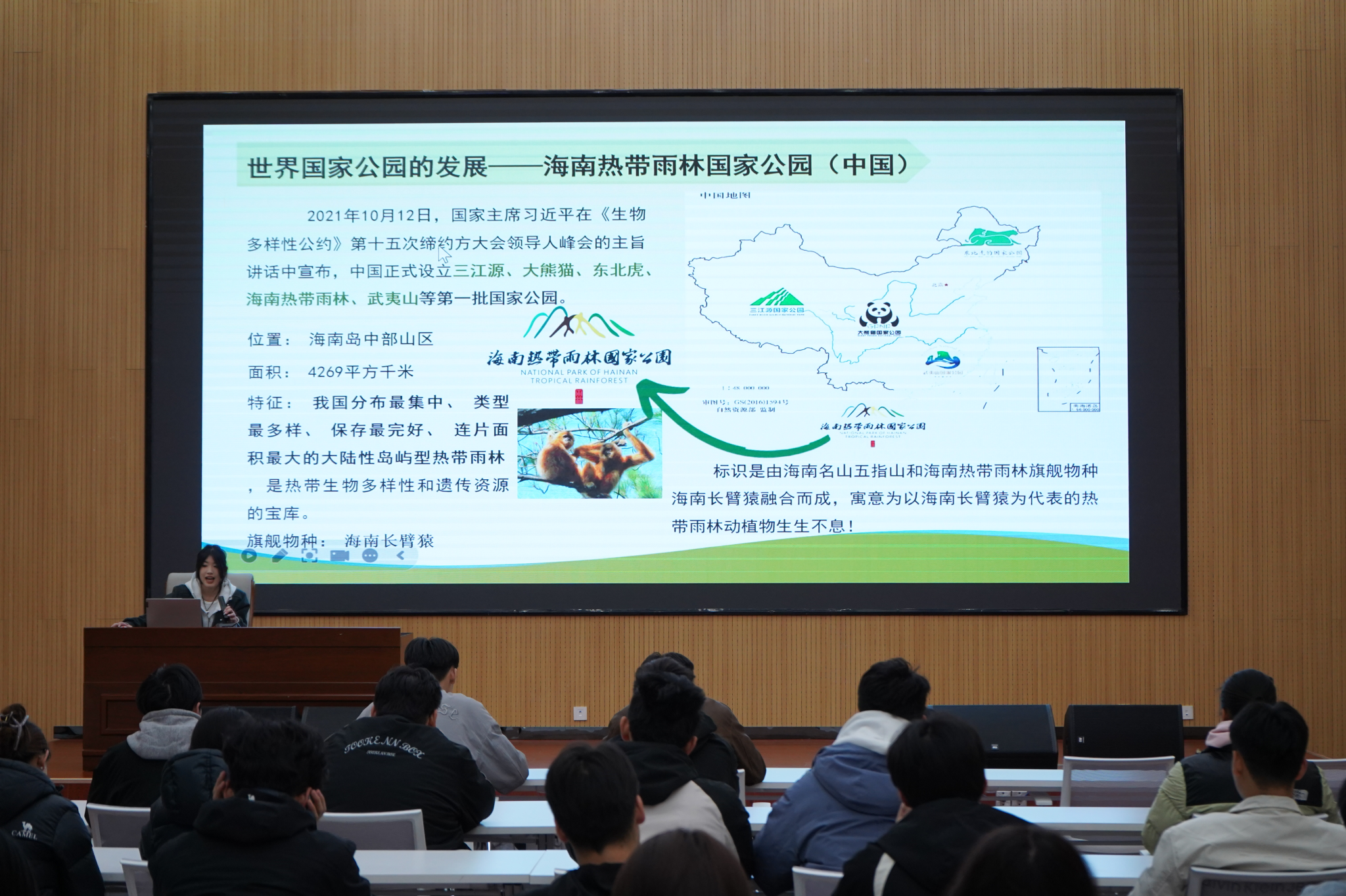 刘可欣从国家公园的生态系统构成、独特的物种资源等方面入手,介绍了国家公园在维护生态平衡、保护生物多样性等方面的关键作用。宣讲过程设置互动答题环节,围绕“生态安全知识”设置题目,同学们踊跃参与,现场气氛热烈。