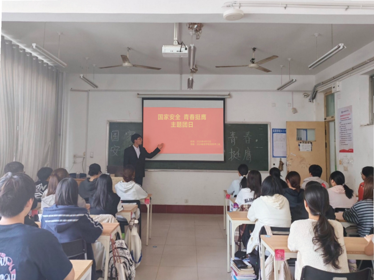 开展“国家安全青春挺膺”精品团课活动。团课由2024级药学专业二班团支部开展。团总支书记王新、副书记林静秋、班主任石珊珊、辅导员老师、团支部全体学生共同参加。大家共同观看了国家安全宣传片,随后刘泽汝同学以“国防你是什么?”为主题开展朗诵。团课中,同学们积极踊跃发言,结合自身经历分享了维护国家安全的感受和体会。活动还组织了宣誓仪式,在领誓人的带领下,现场青年们庄严宣誓,誓言铿锵有力,表达了青年们对维护国家安全的坚定决心。