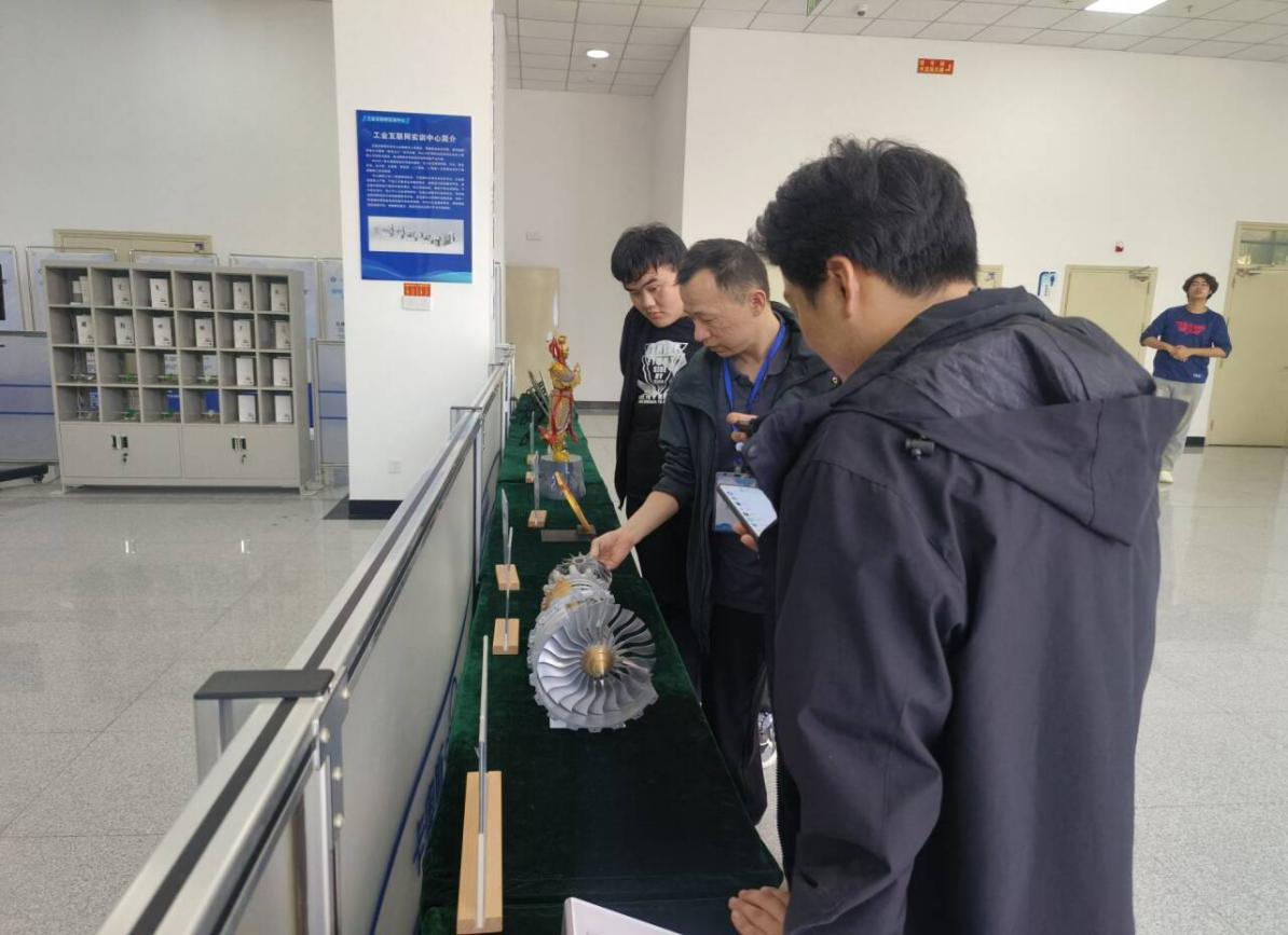 =陈睿对学生运用3D打印技术做出来的涡轮机、塑脂造型等物品进行介绍,并带领学生参观学院往届优秀毕业生展板,引导学生学习榜样事迹,努力提升自己。