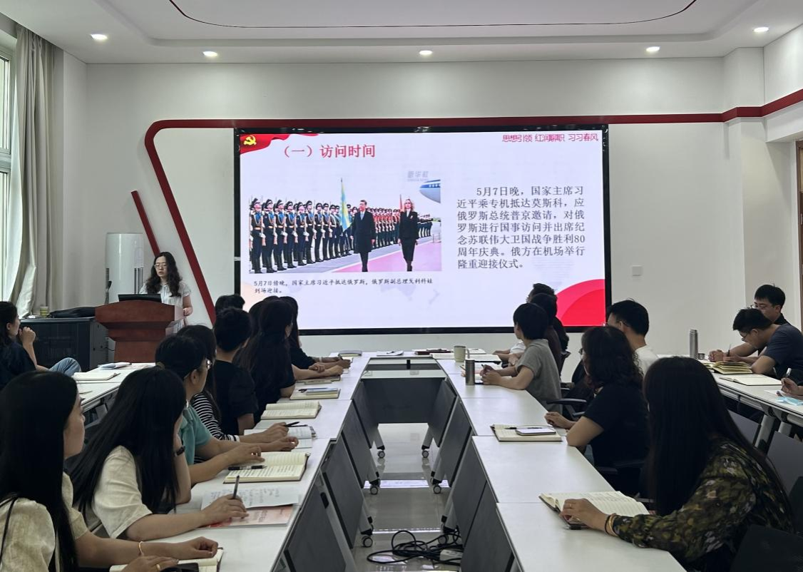 5月15日,马克思主义学院开展“思想引领 红润聊职”行动,党员教师刘颖以《习近平主席对俄罗斯进行国事访问并出席纪念苏联伟大卫国战争胜利80周年庆典纪实》为题,带领全体党员教师共同进行了学习。