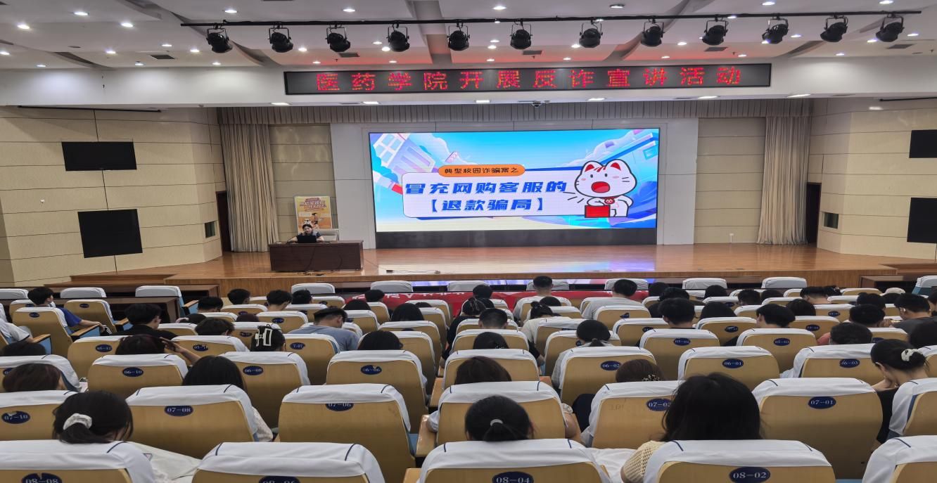 为切实提高学生防范电信网络诈骗意识和能力,筑牢校园反诈“防火墙”,近日,医药学院举办反诈宣讲活动。招商银行聊城分行客户经理刘艳为学院300余名学生带来了一场内容丰富、案例详实的反诈知识讲座。