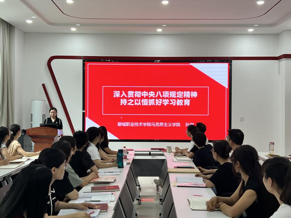 7月2日,聊城职业技术学院马克思主义学院党总支书记孙剑以《深入贯彻中央八项规定精神持之以恒抓好学习教育》为题,为马克思主义学院党员教师讲专题党课。