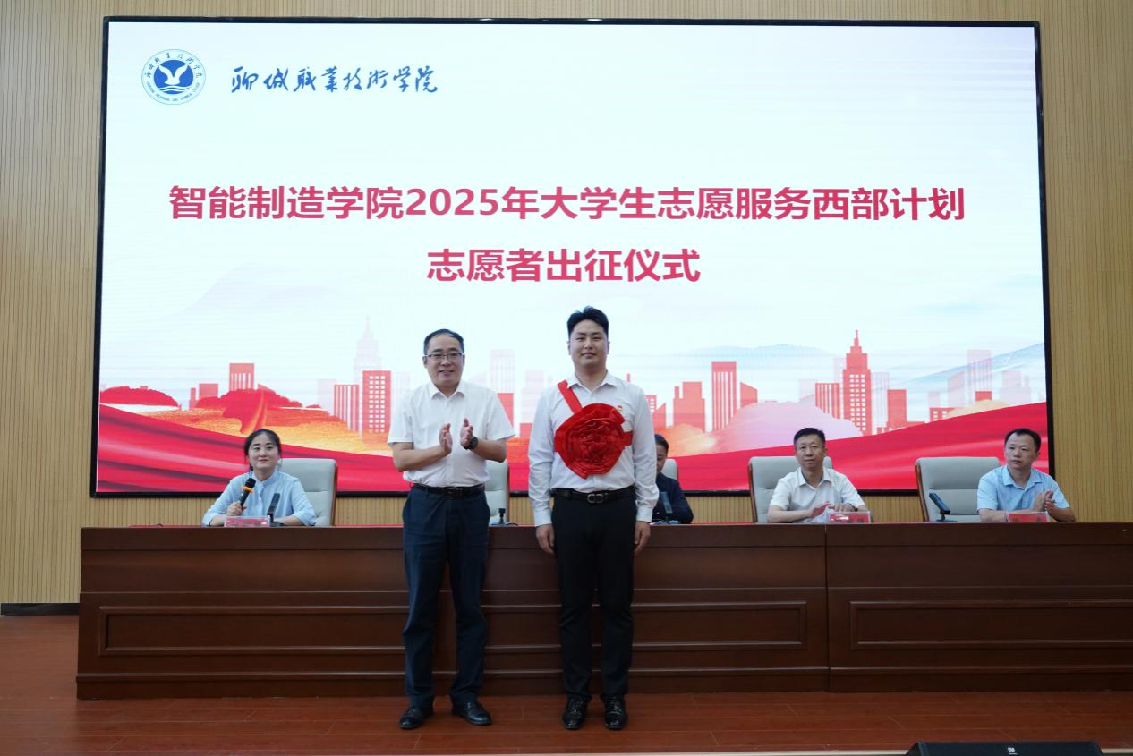现场还举行了大学生志愿服务西部计划志愿者出征仪式,2025届机械制造及自动化技术专业毕业生李令浩经过选拔即将奔赴青海贡献青春力量,任伟为李令浩同学佩戴红花,勉励其到祖国最需要的地方发光发热。