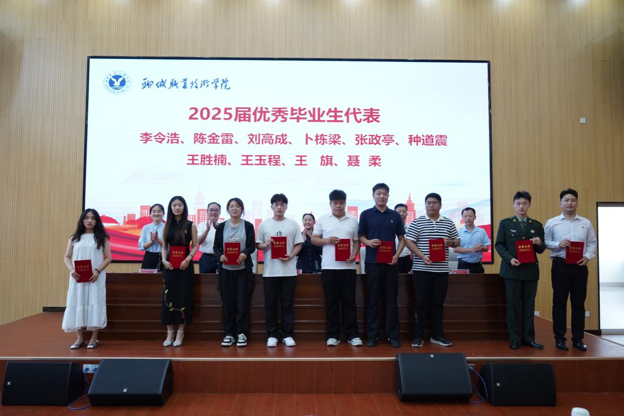 表彰环节,刘丽敏现场宣读优秀毕业生名单,学院与会领导为优秀毕业生代表、毕业生代表颁发荣誉证书与毕业证书;2025届优秀毕业生刘高成结合在校三年的经历,分享学习、生活、工作中的所思所感所悟,鼓励同学们要谨记“厚德 博学 求精创新”的校训,不畏风雨,砥砺前行。