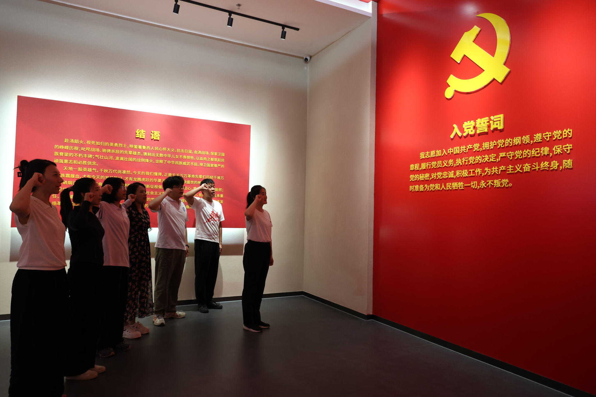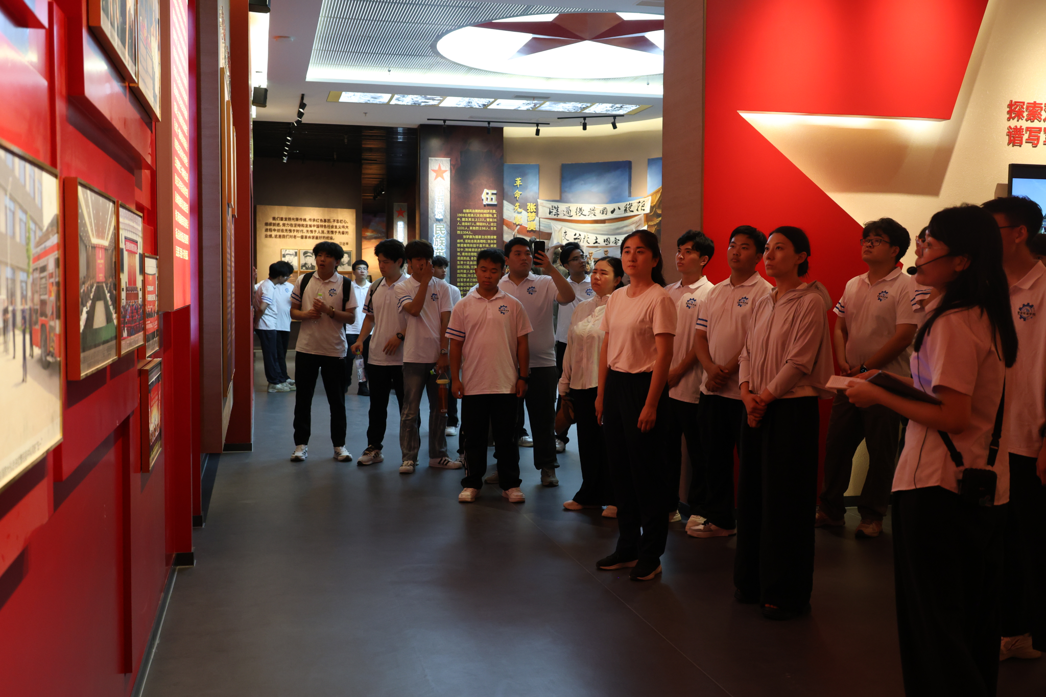实践团到六十二烈士纪念馆开展沉浸式教育,在烈士纪念碑前,四名党员代表敬献花篮,全体师生向革命先烈三鞠躬,表达哀思与敬意。纪念馆内,以“在烈火中永生”为主线的情景式布展,借助声光电技术,再现了85年前六十二烈士奋勇杀敌的场景。实践团在讲解员引导下参观各展厅,聆听革命先烈浴血奋战的事迹,深切感受革命先辈们顽强斗争、不怕牺牲的精神。在宣誓厅,党员师生面向党旗重温入党誓词,铿锵誓言坚定了为党和人民事业奋斗终身的决心。现场还围绕“红色资源赋能育人”开展交流研讨,进一步凝聚以革命精神为引领、以实践行动助振兴的共识。