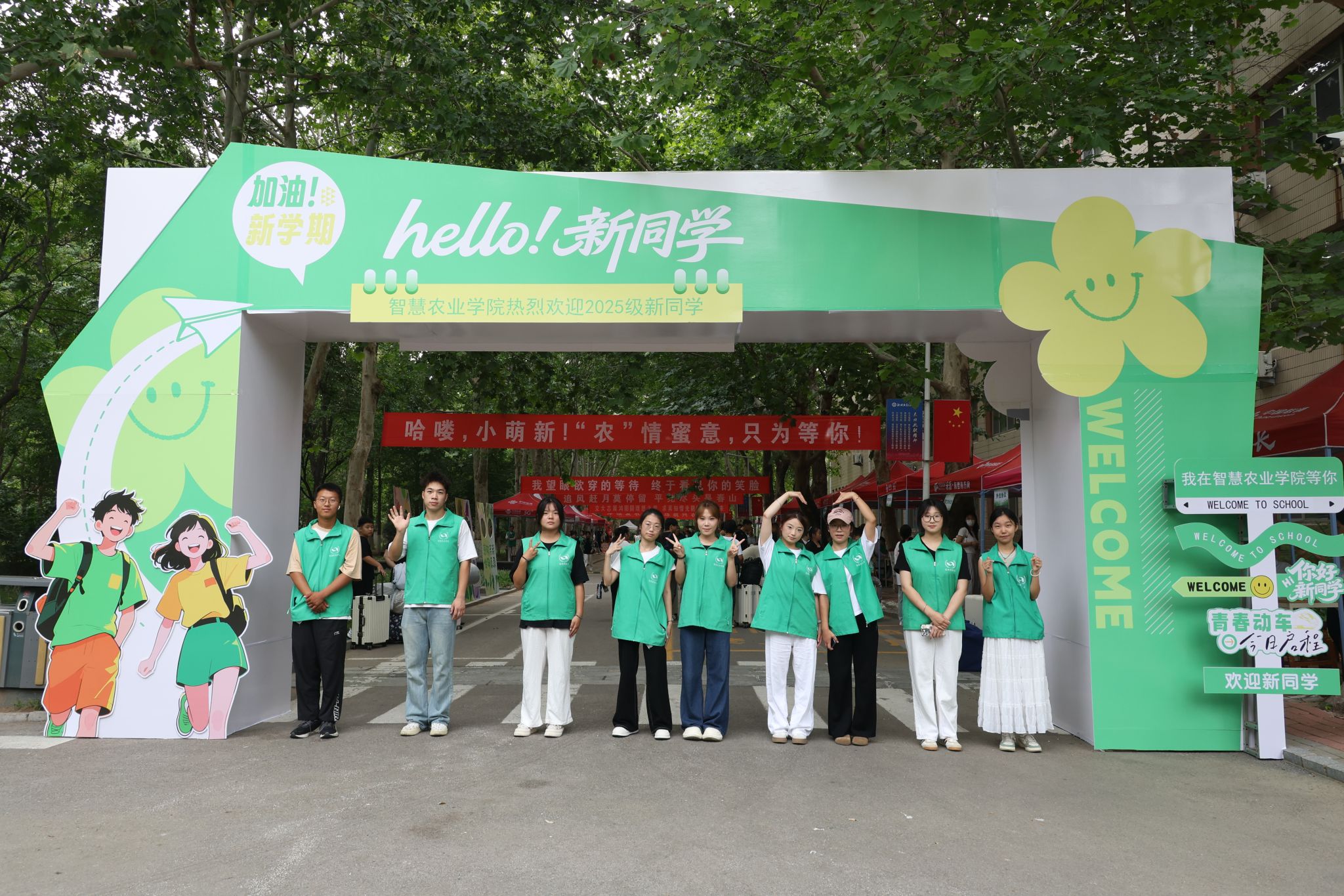 本次迎新活动凸显专业特色与人文关怀并重的氛围设计。学院精心设置了“我♥聊职”主题打卡站台,吸引了众多新生及家长合影留念,留下大学第一刻的珍贵记忆。“满心欢喜 智农等你”的巨幅展板以温暖的话语传递学院对学子的热烈欢迎。更加引人注目的是报到入口清新绿色的拱门,象征着农业的生机与希望,也喻示着新生学习之旅的开启。“强农有我 青春有为”的新生签名墙,印证着每一位“新农人”投身农业的初心承诺。