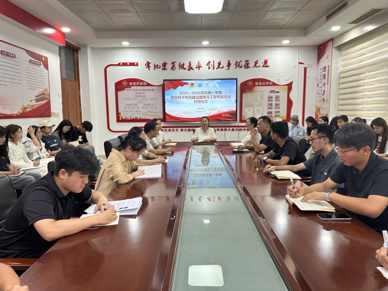 为加强学生骨干队伍建设,提升学生干部的思想政治素养和工作作风,9月2日,经贸学院开展“青马工程”2025—2026 学年第一学期学生骨干作风建设暨第一讲活动。经贸学院团总支副书记苏飞,学工组长郭怡、石茜,辅导员及40余人学生骨干参加。