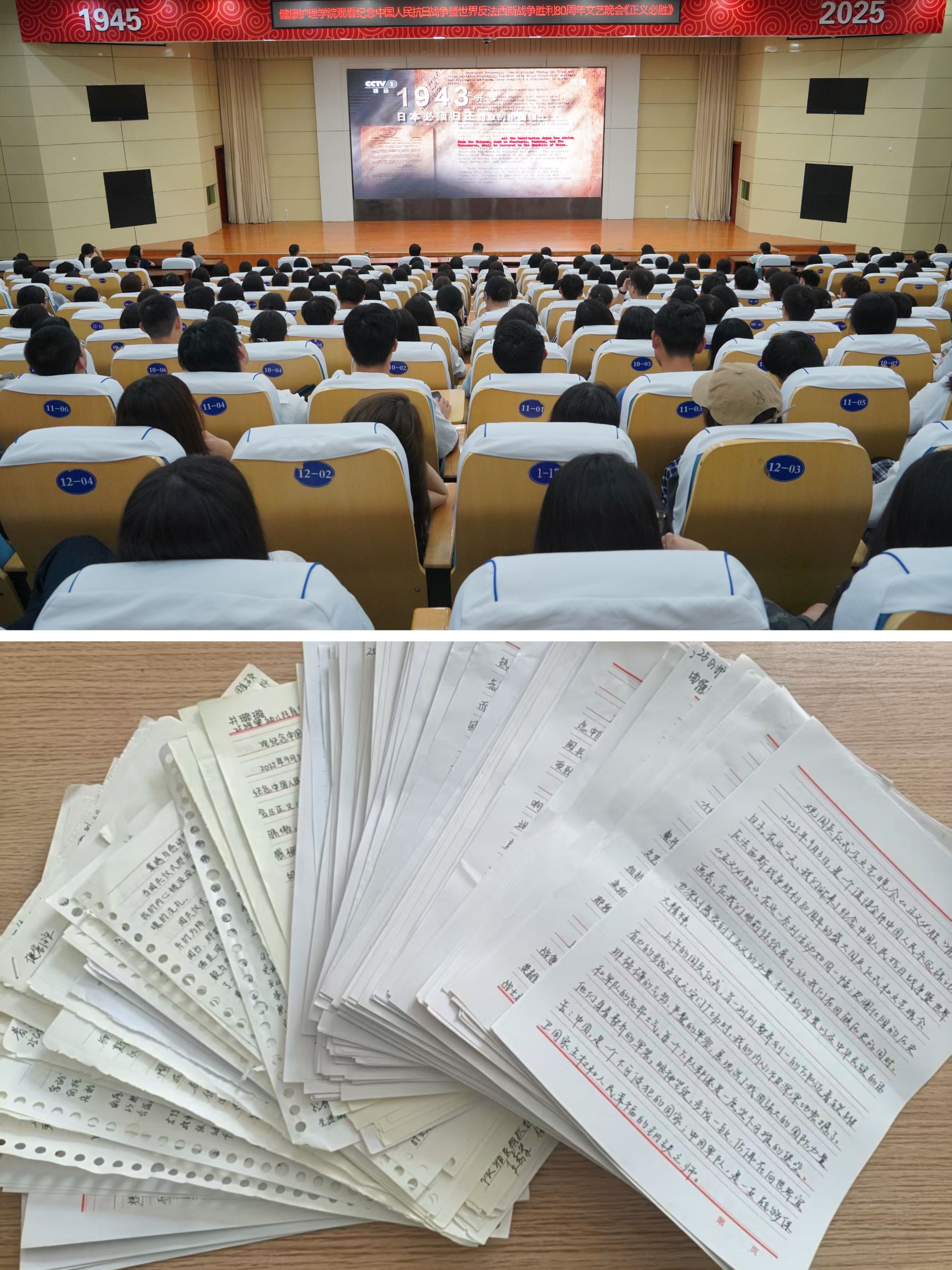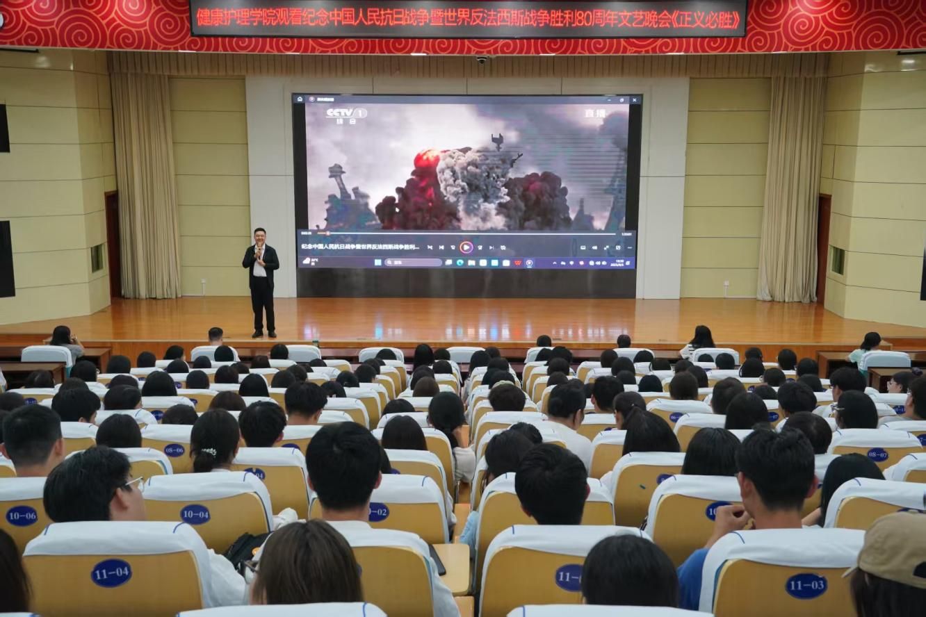 观看文艺晚会,激扬报国热忱。9月5日,健康护理学院组织2025级新生及班主任、辅导员共同观看了纪念中国人民抗日战争暨世界反法西斯战争胜利80周年文艺晚会《正义必胜》。观演前,校团委书记、学院党总支副书记张博文通过抗战历史问答、晚会理念设计等方面做了文艺思政课导言,整台晚会以九一八事变到抗日战争胜利的时间线为主轴,通过音乐、舞蹈、戏剧等多种艺术形式,生动展现了中国人民在抗日战争中英勇抗争的壮丽画卷,让师生们深刻感受到了革命先烈们的英勇无畏和牺牲精神。不少师生在观看过程中热泪盈眶,被那段波澜壮阔的历史所深深打动。