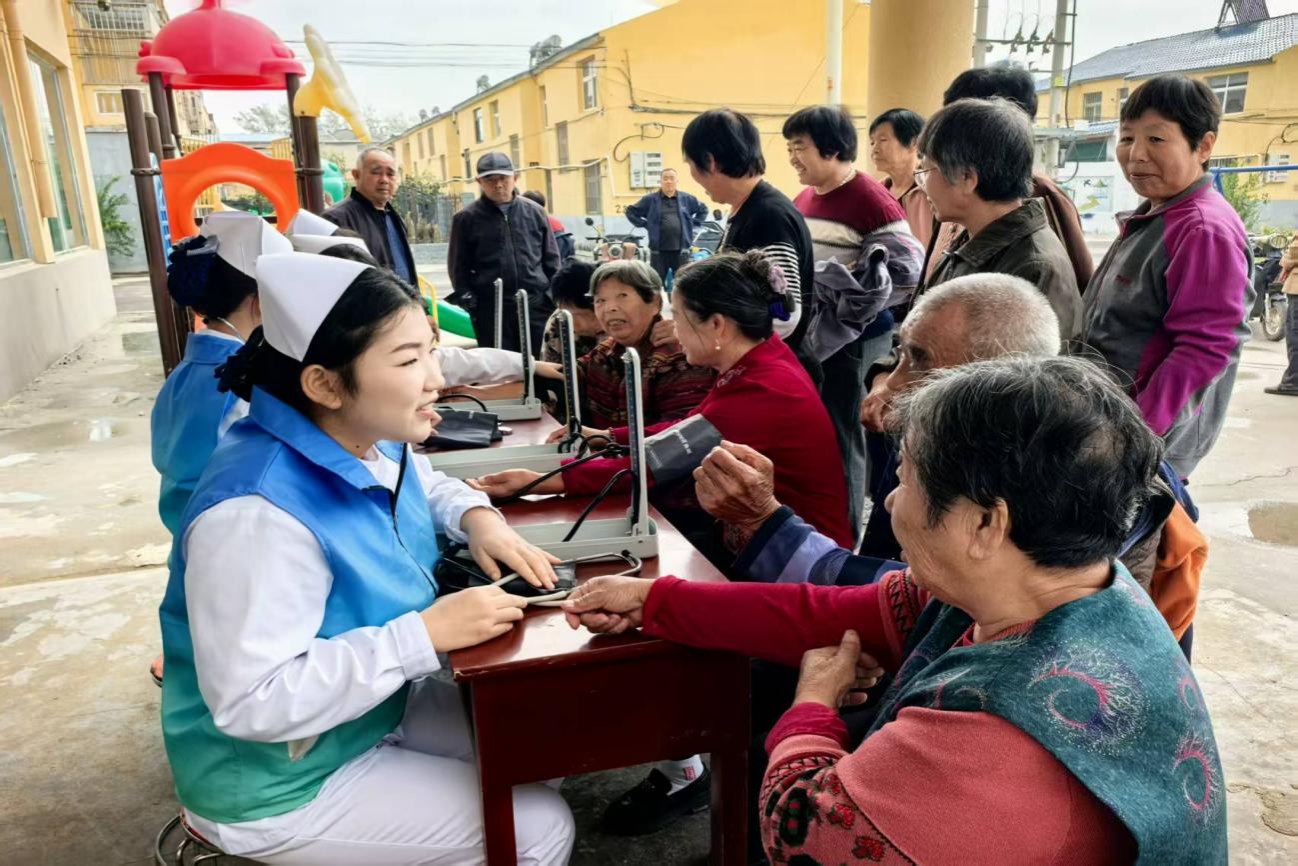 随后,一行人赴郭屯镇姜邢村开展“党建共建聚合力 青春义诊暖民心”志愿服务活动。党员老师与学生志愿者充分发挥专业特长,现场开展了以急救知识科普、测量血压、健康咨询为主要内容的志愿服务。志愿者们耐心细致地为前来咨询的居民讲解基础健康知识,倡导健康生活方式,受到了当地群众的热烈欢迎和好评。通过本次志愿服务,不仅锻炼了学生的实践能力,也切实将健康服务送到了群众身边,体现了高校服务社会的责任担当。