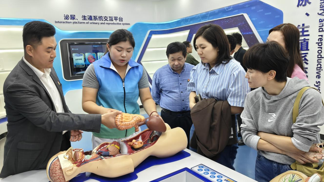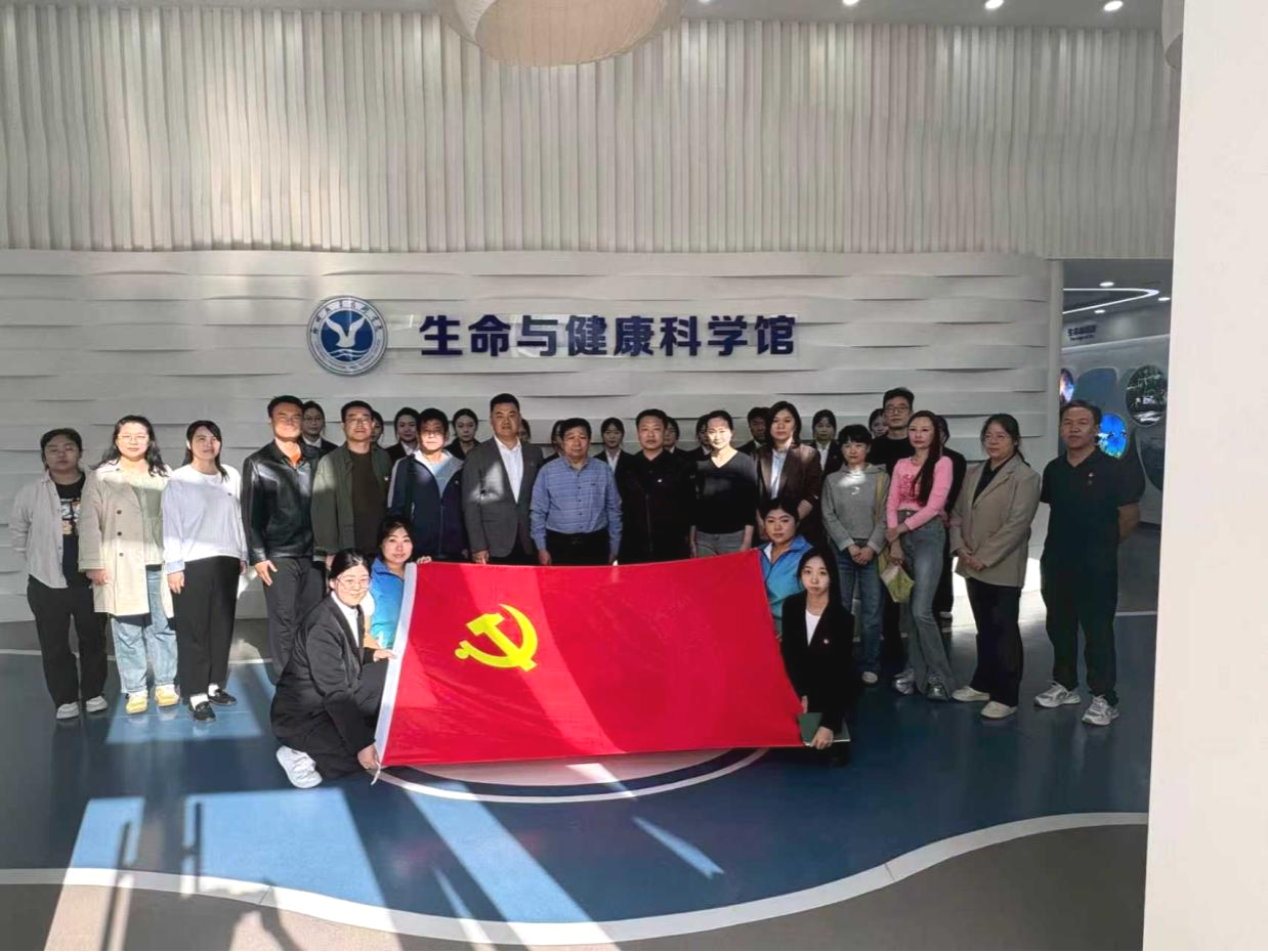 座谈会后,在健康护理学院学生党员讲解员的带领下,全体人员走进生命与健康科学馆开展沉浸式学习。在“解密生命”展区,党员们驻足于生命起源假说图示前,聆听从医学起源到现代护理发展的专业讲解;在“精妙人体”展区,通过立体模型与互动设备深入了解人体生理结构;而在健康互动体验区,大家亲自操作 VR 健康监测设备,直观感受科技赋能健康管理的便捷性。