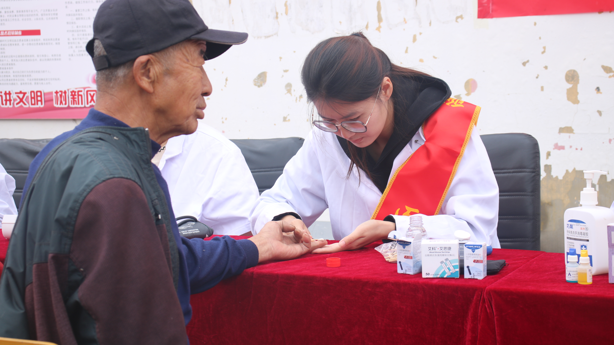 活动现场,学院专业教师充分发挥自身优势,化身“乡村健康守护者”。他们耐心细致地为前来咨询的村民进行中医问诊,通过望闻问切,辨证施治,为村民答疑解惑,并提供个性化的用药指导和养生建议。老师们专业的医术和亲和的态度,赢得了村民们的连连称赞。学生志愿者们运用在校所学的专业技能,热情地为村民们测量血压、检测血糖、血型,并认真做好记录,对指标异常的村民给予温馨的健康提醒。在康复按摩区,学生们手法专业、力道适中,为常年劳作的村民缓解了肩颈腰腿的疲劳酸痛,展现了良好的职业素养。