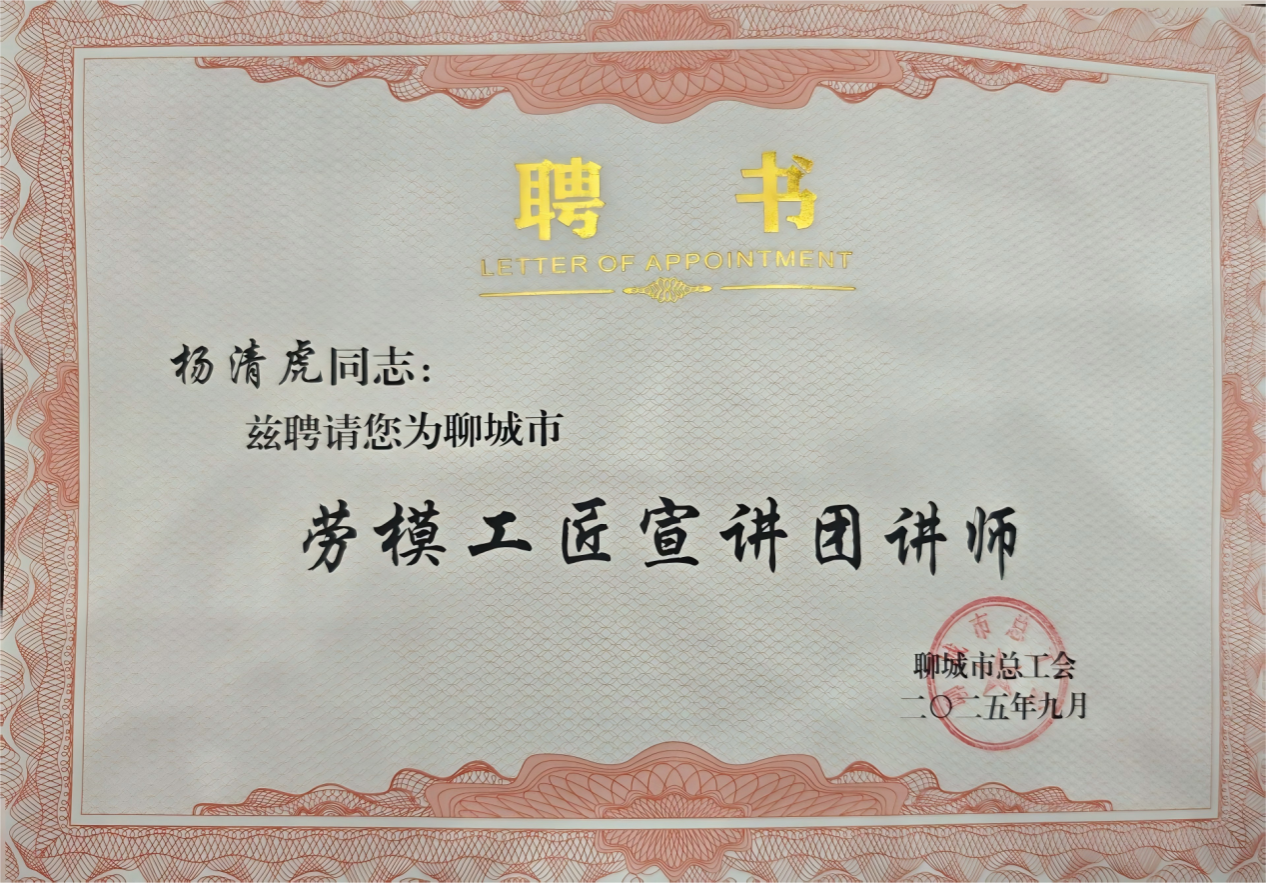 为深入贯彻习近平新时代中国特色社会主义思想,大力弘扬劳模精神、劳动精神、工匠精神,充分发挥劳模工匠示范引领作用,深化职工思想政治引领与素质提升工作,聊城市总工会组建聊城市劳模工匠宣讲团并举办聘任仪式。近日,该仪式在聊城市工人文化宫报告厅隆重举行,全市各行业优秀劳动者代表齐聚现场,共同见证这一重要时刻。其中,我校智能制造学院教师杨清虎凭借卓越成就与兢兢业业的治学态度,获聘宣讲团讲师。