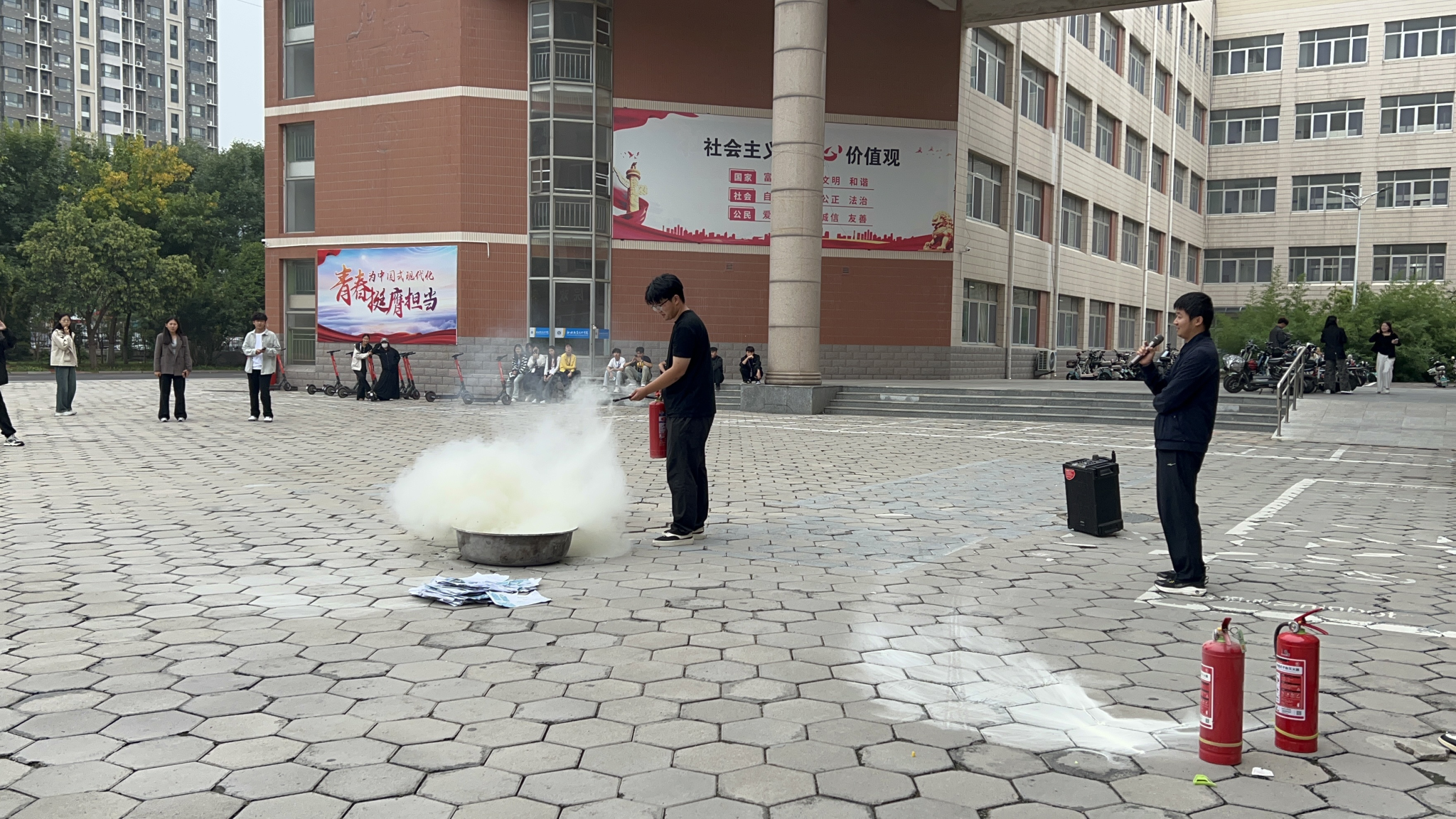 徐龙刚现场讲解并演示了干粉灭火器的“提、拔、握、压”四步使用法,并结合真实案例,深入浅出地讲解了初期火灾扑救的关键要点。随后,学生根据指导分批次进行实操。“第一次真正使用灭火器,虽然有点紧张,但掌握了方法后就踏实多了。”参加演练的大一学生王同学表示。