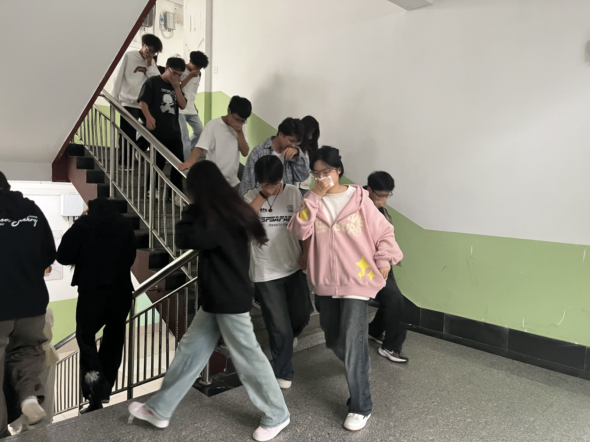 下午3时整,消防应急演练正式拉开帷幕。在各楼层安全引导员的指挥下,师生们迅速反应,立即用衣袖或湿巾捂住口鼻,弯腰低姿,按照疏散示意图和指定逃生路线,快速、有序地撤离教学楼。整个疏散过程井然有序,无推挤、踩踏现象,全体人员在3分钟内全部安全抵达操场集合点,充分展现了良好的应急素养。