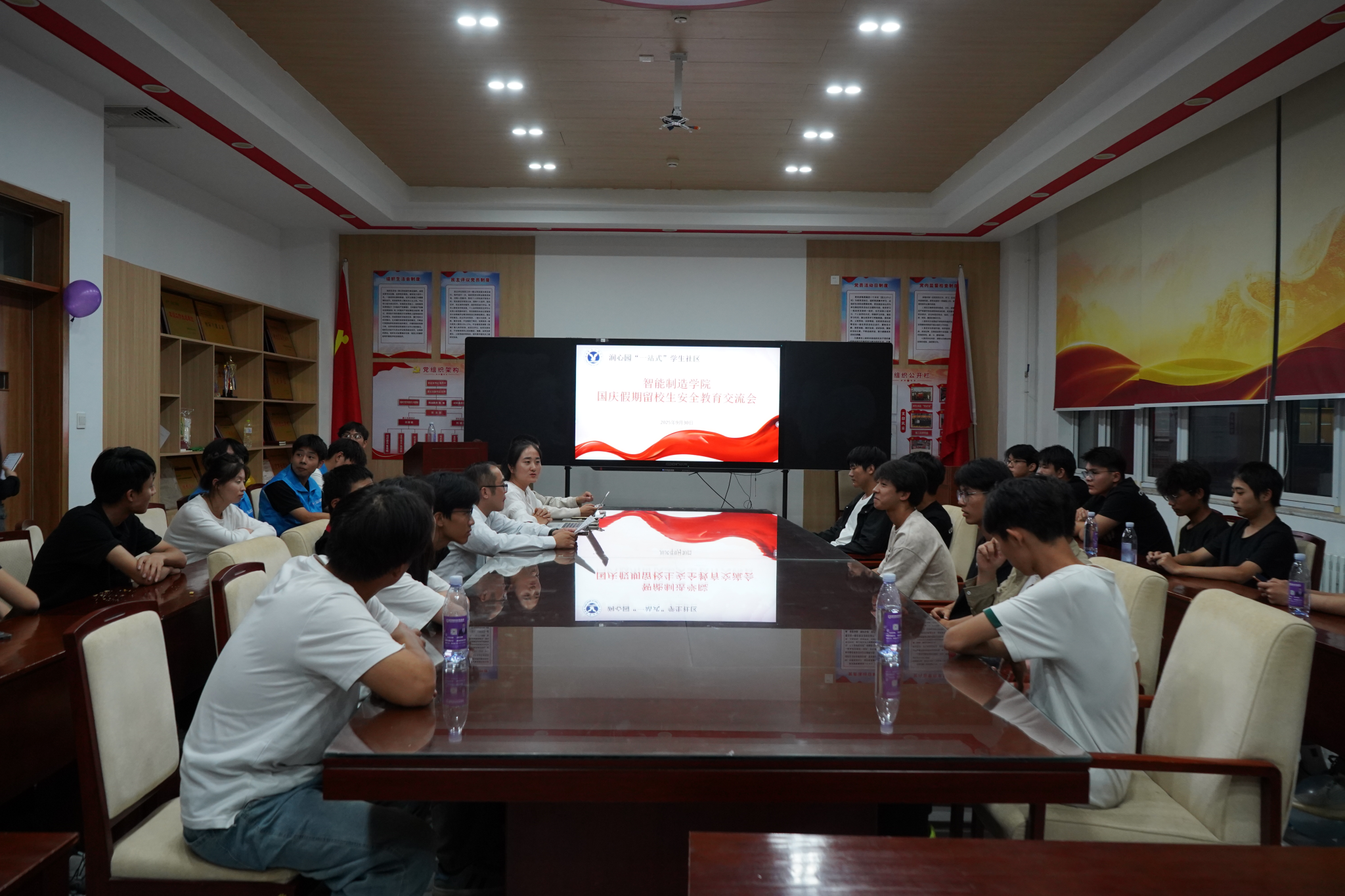 为切实做好国庆假期留校学生的服务工作,增强学生安全防范意识,确保留校生度过安全、温馨的双节假期,9月30日,智能制造学院举办“情暖双节·智造同行”留校生安全教育暨茶话联欢会。智能制造学院党总支副书记任伟,团总支副书记刘丽敏、辅导员徐同、郝文晓、于敏以及40余名留校学生代表参加活动。