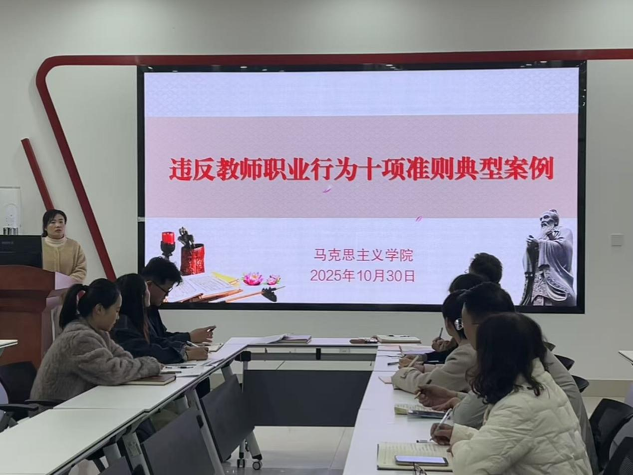 为深入贯彻落实立德树人根本任务,强化教师职业道德建设,筑牢思想道德防线,10月30日,马克思主义学院组织全体教师开展师德师风专题学习活动,集中学习《违反教师职业行为十项准则典型案例》,通过剖析反面典型案例,引导教师深刻汲取教训,严守职业底线,争做“四有”好老师。