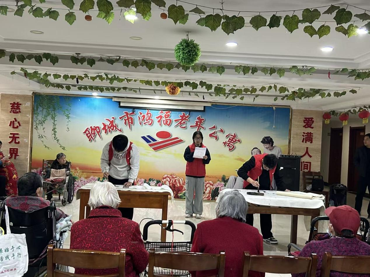 随后,志愿者与老年人围坐一起,提笔书写重阳节祝福。志愿者们耐心创作,一幅幅“福寿绵长”“福如东海”等书法作品相继完成;老年人也积极参与,在笔墨间传递对生活的热爱;指导老师李金鹏现场挥毫,写下寓意美好的书法作品赠予老年人。