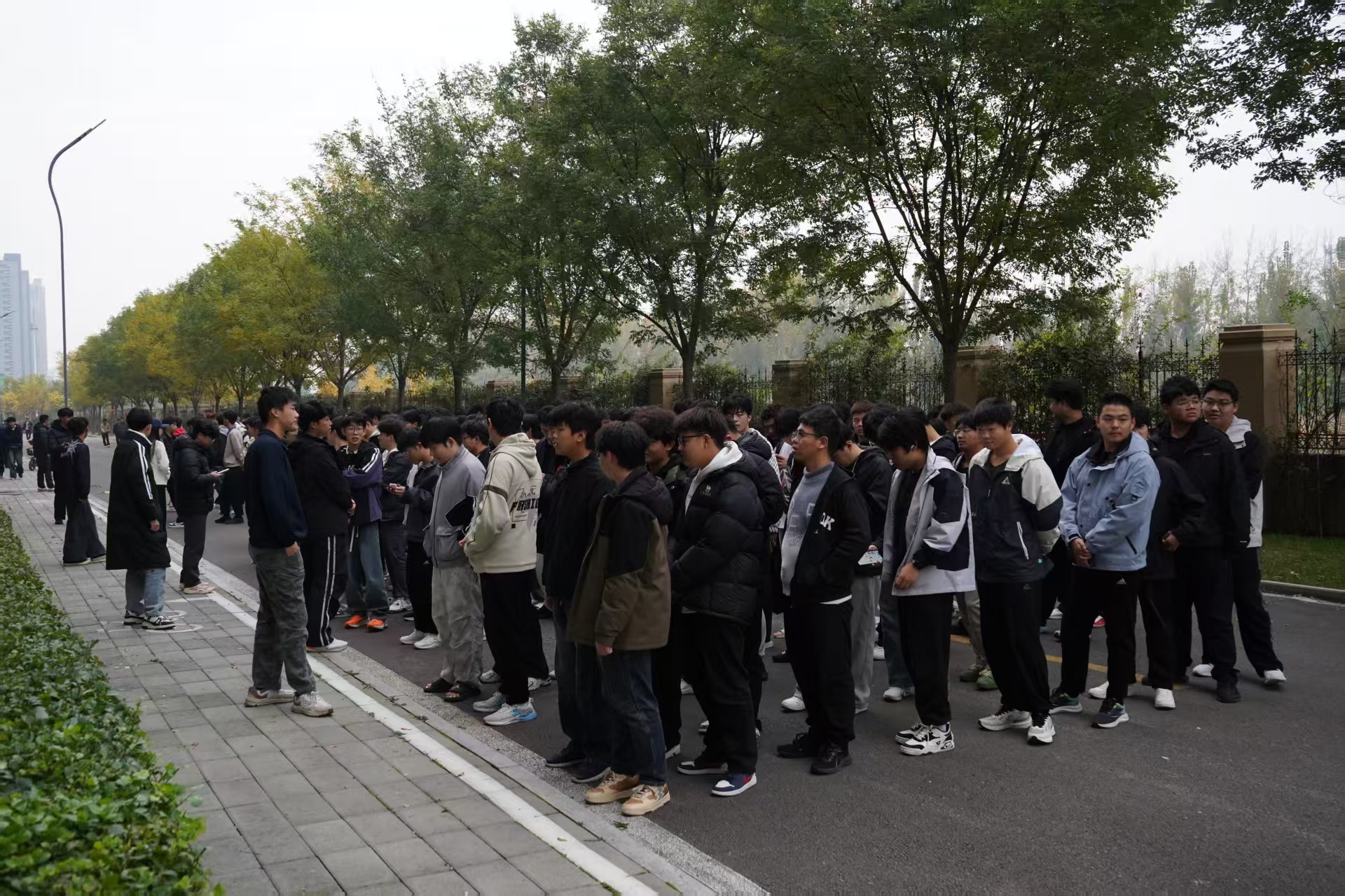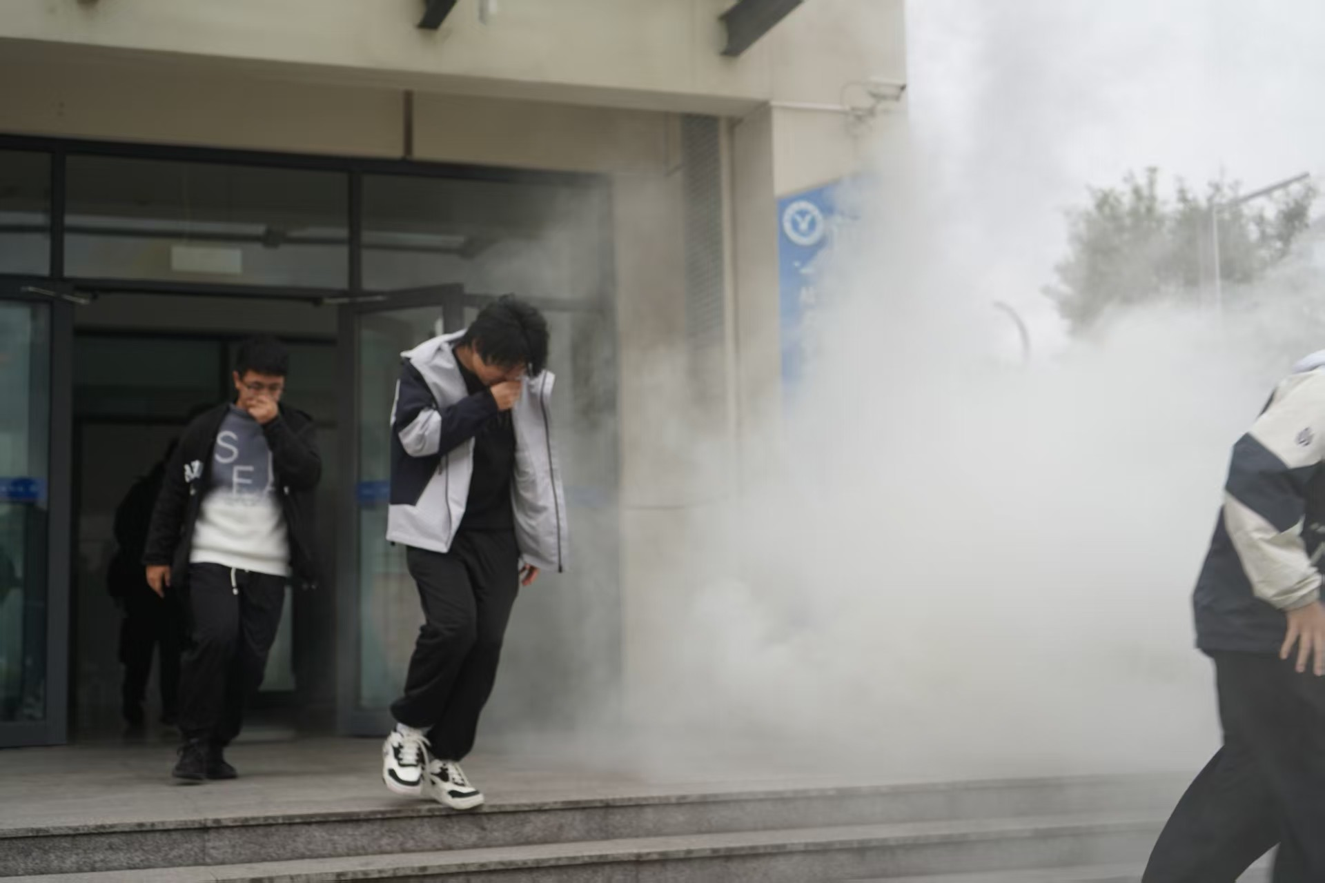 消防哨声响起,模拟三号宿舍楼突发“火情”并产生大量烟雾。宿舍管理员迅速到岗,依预设方案引导学生以“湿毛巾捂口鼻、弯腰低姿、沿墙行进”方式避险,有序撤离。学生听从指挥、相互协助,避开易拥堵部位,高效抵达安全集合点。全体集结后,工作人员立即清点人数、核实上报,确保无遗漏,保障演练安全闭环。