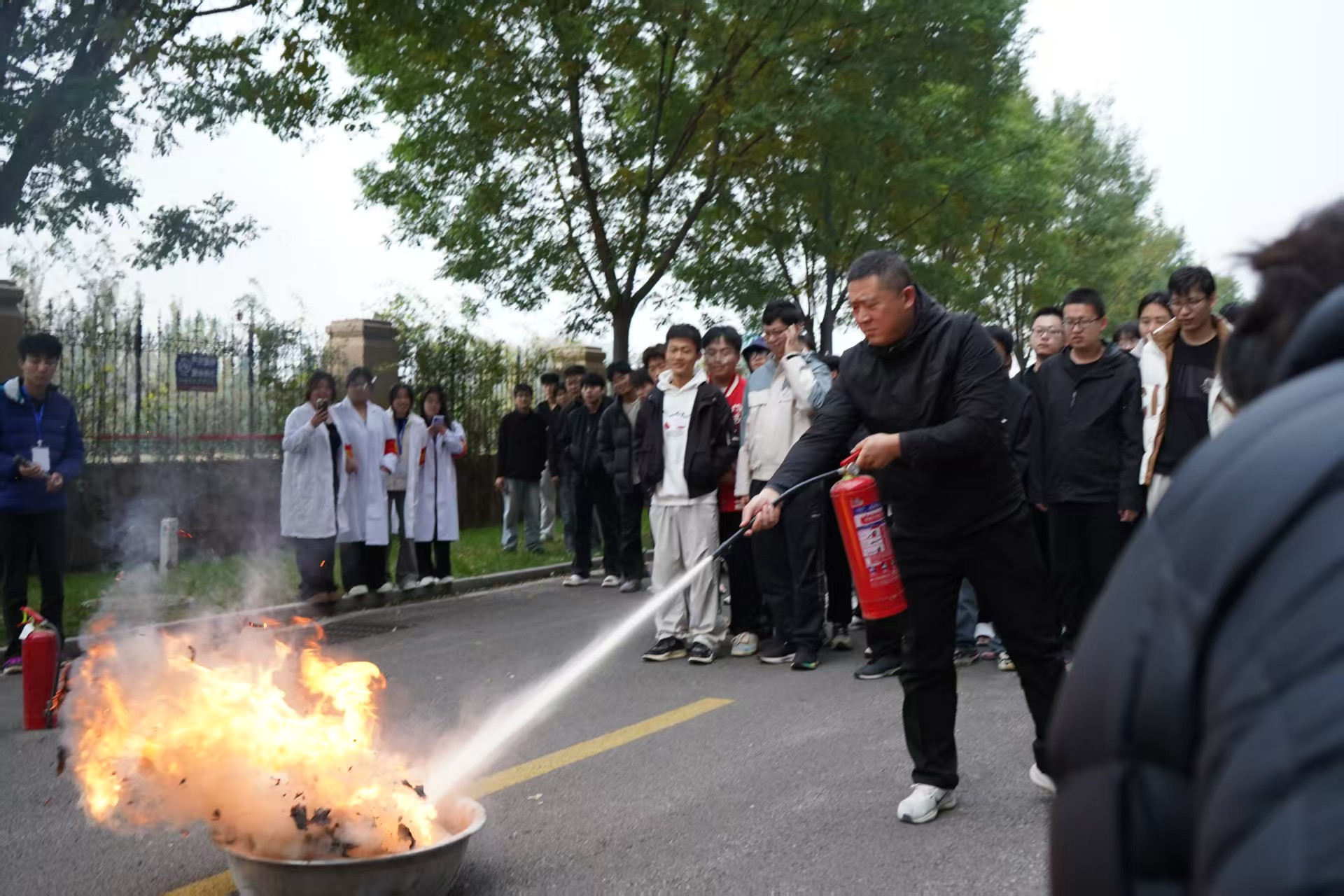 周涛聚焦灭火器实操,详细演示“提、拔、握、压”四步操作,邀请学生代表亲身体验。通过“理论+实践”模式,助力学生深化消防器材使用认知。演练尾声,周涛总结点评,肯定演练组织与学生表现,强调消防安全的重要性与长期性。