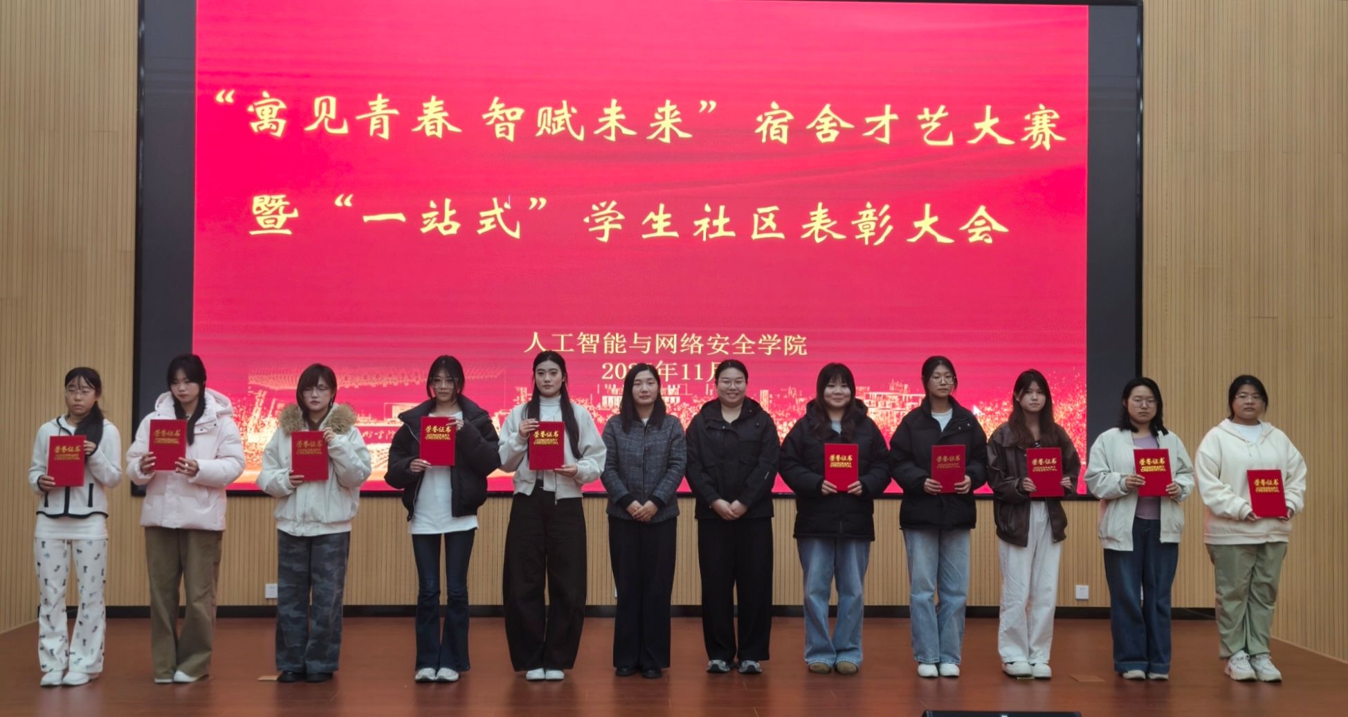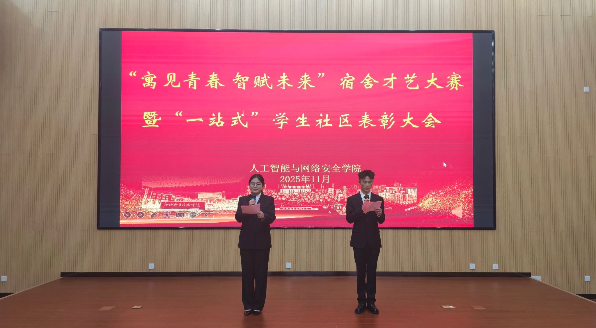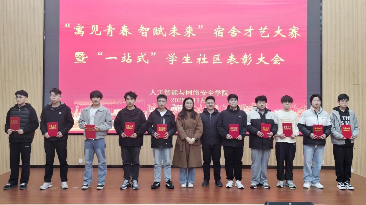 为丰富新生校园文化生活,彰显“一站式”学生社区育人成效,11月10日,人工智能与网络安全学院举办“寓见青春 智赋未来”宿舍才艺大赛暨“一站式”学生社区表彰大会。学院团总支书记王哲、全体辅导员及部分学生齐聚现场,共赏青春盛宴,见证榜样力量。