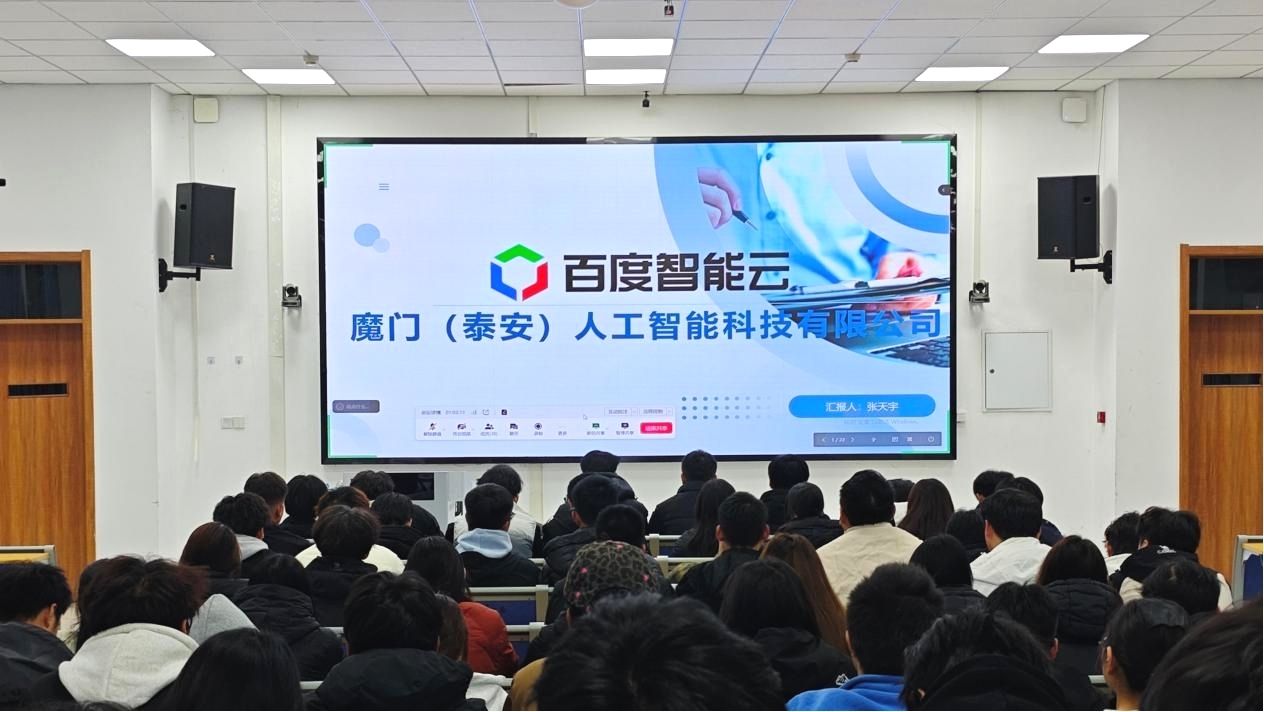 招聘会特邀魔门(泰安)人工智能科技有限公司作为重点招聘单位。企业代表通过宣讲会形式,详细介绍了公司业务范围、岗位需求、工作内容及薪资待遇等情况。魔门(泰安)公司依托百度智能云技术资源,专注于人工智能算法、大数据分析、数据标注等方向,为学生们描绘了清晰的职业发展路径。
