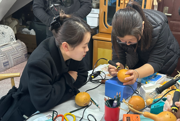动手体验环节,师生与街道青年围坐一堂,在杨永梅的耐心指导下开启雕刻尝试。从挑选葫芦、勾勒底稿,到握刀发力、精细雕琢,大家专注投入,不时相互交流心得,向传承人请教技法要领。“看似简单的雕刻动作,实则需要极大的耐心和专注力,这让我深刻体会到非遗传承人的坚守不易。”经贸学院学生何宗硕感慨道。