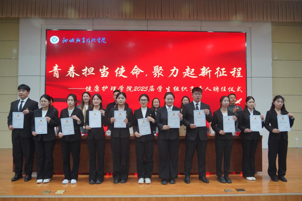 大会现场还为健康护理学院2025届学生组织负责人代表颁发聘书。他们将以“桥梁纽带”身份,助力学院日常管理与服务保障工作。同时,为在省级以上比赛中获奖的同学颁发荣誉证书,表彰他们在急救技能、卫生法律知识竞赛等领域的优异成绩,激励全体学子勤学苦练、争先创优。2024级学生代表齐高忠宣读《健康护理学院学风建设倡议书》,呼吁同学们以实际行动践行优良学风。