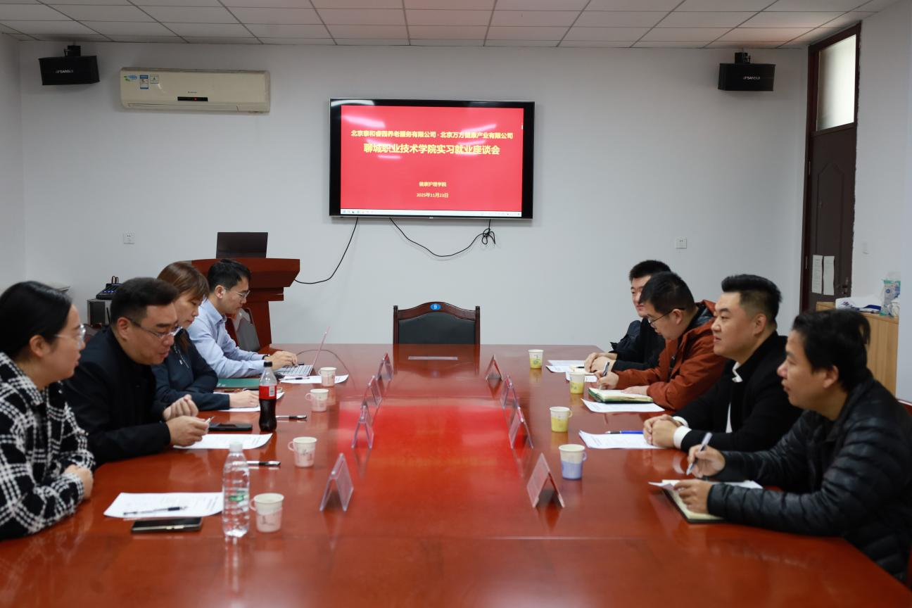 为精准对接康养产业智能化、高端化发展需求,深化产教融合协同育人,聊城职业技术学院健康护理学院与北京泰和睿园养老服务有限公司、北京万方健康产业有限公司联合举办实习就业一体化交流座谈。校团委书记、健康护理学院党总支副书记张博文、健康护理学院副院长戴波、团总支副书记杨清刚和班主任老师代表出席会议。