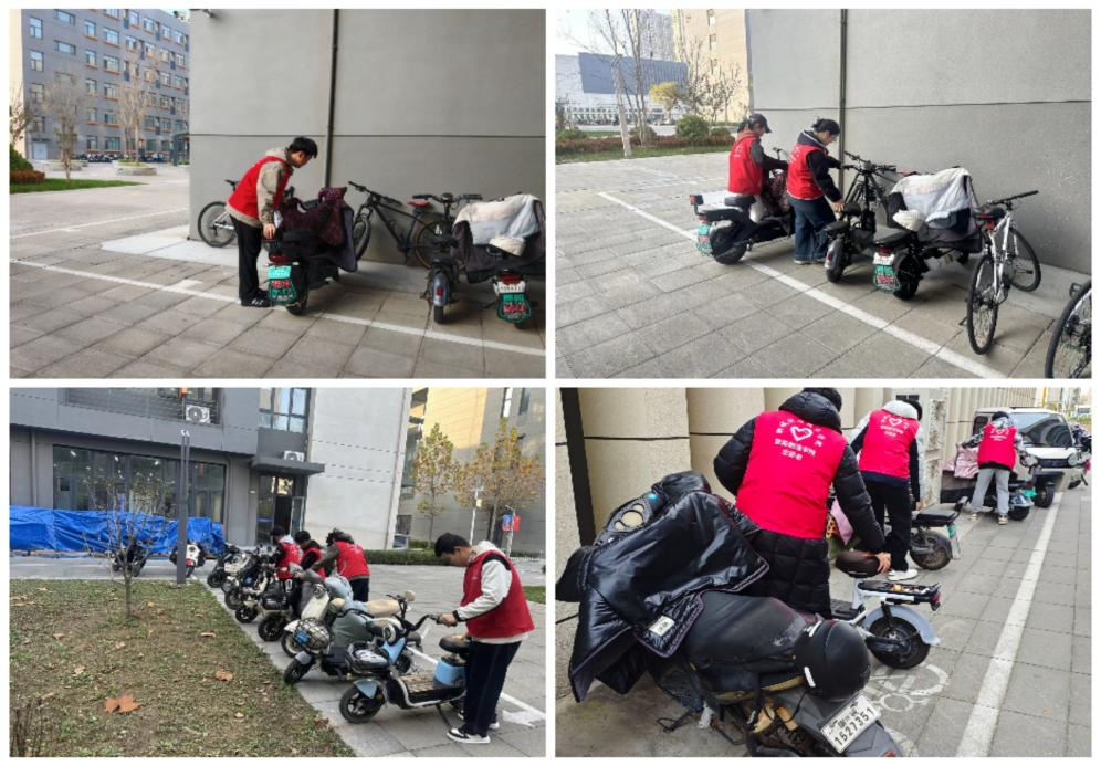 志愿服务提升环境。学院招募了20名学生志愿者积极参与“摆放电动车”志愿服务,解决校园内电动车停放杂乱的问题,以实际行动助力校园消防安全环境整体提升。