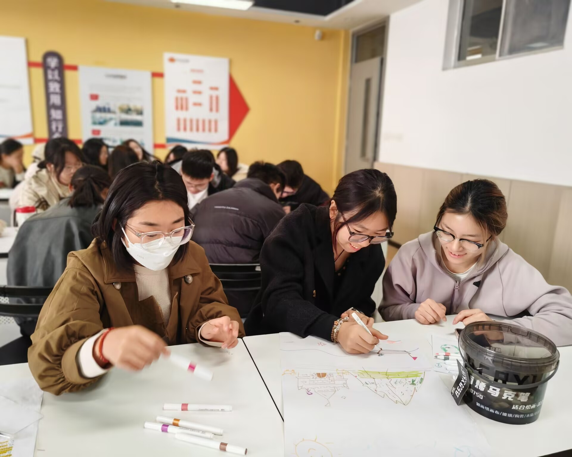 活动以“可视化自我认知”为主题,通过两大环节系统展开。在“六维自我介绍法”模块,薛静老师引导学生从专业技能、兴趣爱好等维度进行自我画像,了解自身的性格特质、动力来源与价值追求,形成对“我是谁、我能做、我想成为谁”的清晰认知。在随后的霍兰德职业兴趣岛测试环节,学生根据偏好选择“艺术岛”、“企业岛”等虚拟岛屿,通过互动游戏解析职业倾向,然后按照不同选择对学生进行分组,绘制专属岛屿海报,并结合兴趣特质制定“岛规”,同学们脑洞大开、分工协作,现场诞生“桃花源记”“琼丰岛”等特色岛屿,生动展现团队协作与职业定位融合的思考。