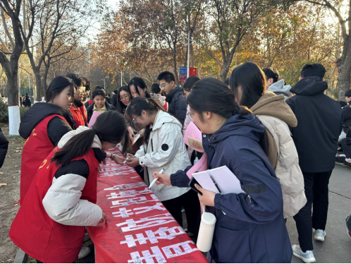 为做好防艾知识宣传,普及防艾相关知识以及防艾政策法规,医药学院组织学生在校医院门口进行签名活动。过往师生纷纷驻足,郑重地在条幅上签下自己的名字,表达“拒绝歧视、携手抗艾”的坚定决心。