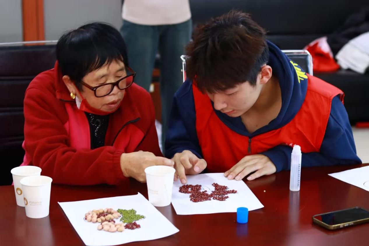 老人们兴致盎然地挑选食材,在志愿者的一对一指导下构图、粘贴、修饰。从勾勒轮廓到填充细节,从色彩搭配到整体调整,每一个环节都充满欢声笑语。有的老人发挥想象力创作专属图案,有的则与志愿者合作完成作品,一幅幅融入五谷清香的创意画作,既承载着对健康长寿的期盼,也定格了老少互动的温馨瞬间。活动间隙,志愿者还与老人们亲切唠家常,倾听岁月故事,普及健康养生小知识,让陪伴与关怀直达心底。