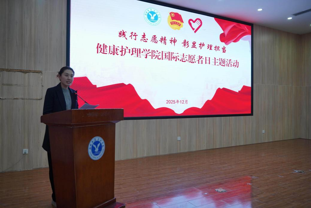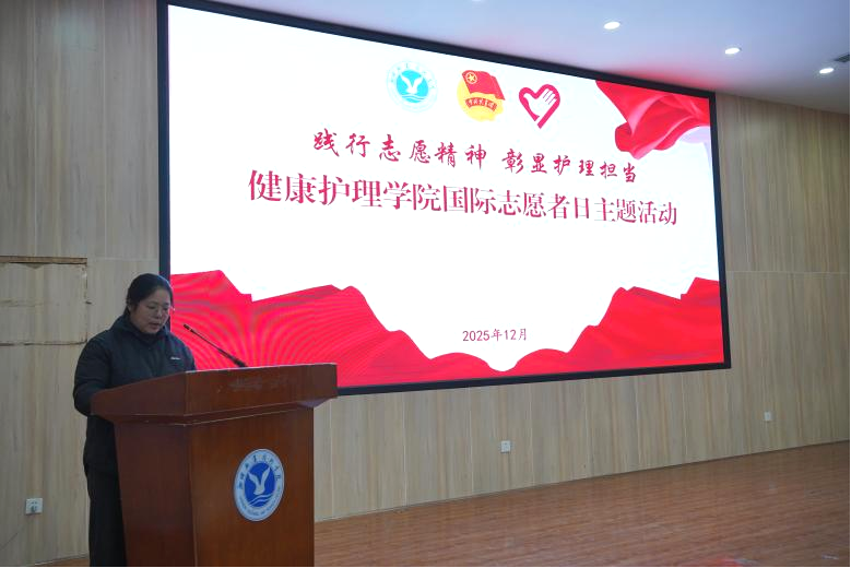 健康护理学院团总支副书记张翠翠致辞。她回顾了学院志愿服务工作的丰硕成果,向长期以来默默奉献的志愿者们表示衷心感谢,并鼓励全体青年志愿者以此次活动为契机,继续秉持“奉献、友爱、互助、进步”的志愿精神,在志愿服务中锤炼品格、增长才干,用实际行动诠释护理专业学子的责任与担当。