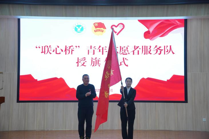 授旗仪式环节,苏金生为健康护理学院“联心桥”青年志愿者服务队授旗。这面旗帜不仅是荣誉的象征,更是责任的传递,标志着学院志愿服务工作将迈向新的征程,进一步加强与社会机构的联动合作,拓展志愿服务的广度与深度。