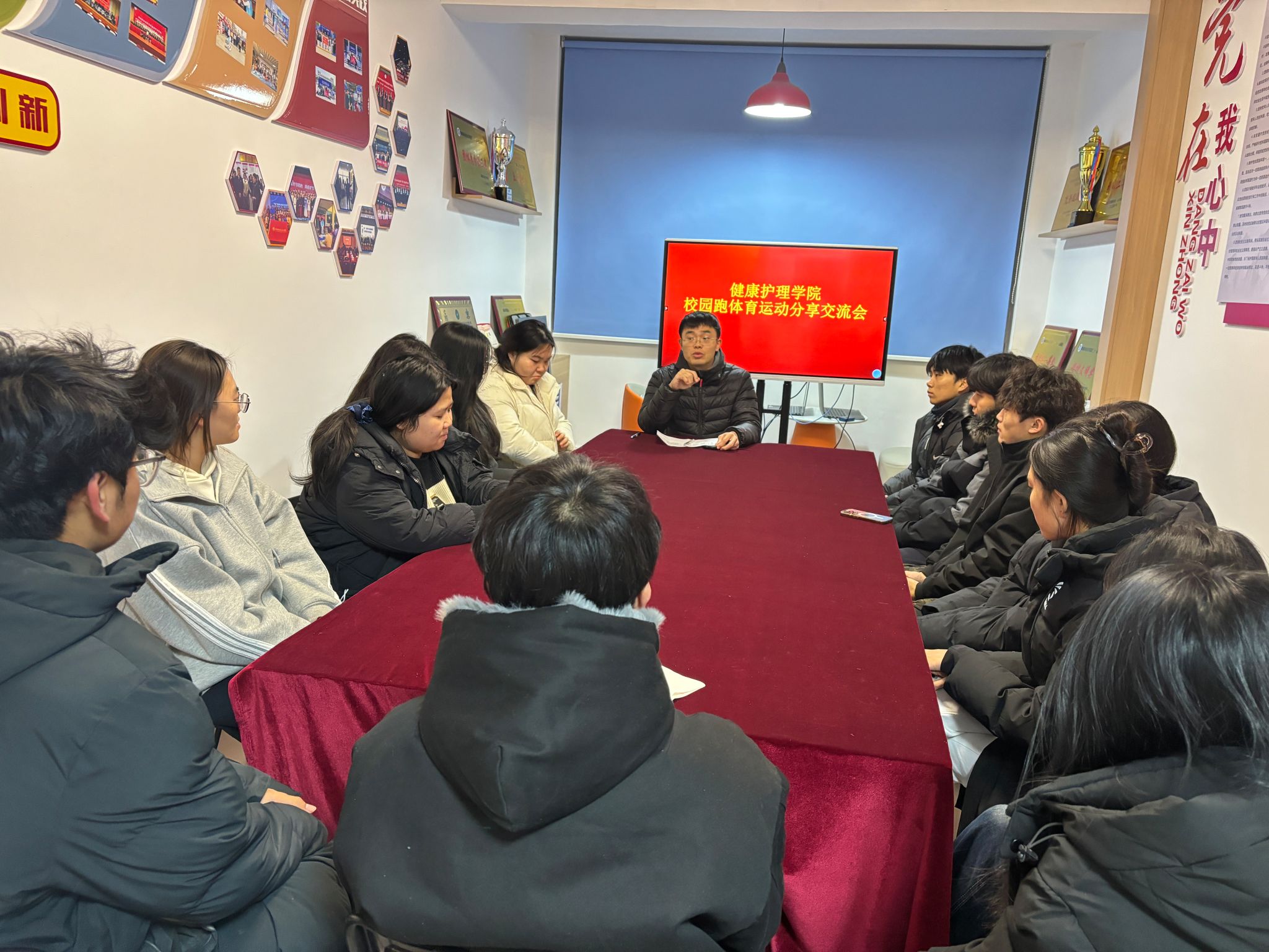 为贯彻“健康第一”理念、推进“三走”阳光体育运动,解答学生校园跑与早操疑问,12月4日晚,健康护理学院在“一站式”社区举办“跃动青春,奔跑同行”校园跑交流分享会,由辅导员郭朝盟主持,各班级体育委员参会。