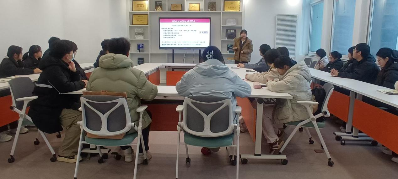教师郭怡然围绕四六级考试的答题技巧、临场发挥、心态调整及“夺分”策略等展开系统指导。她引导学生正确看待考试压力,客观分析自身优势与不足,掌握科学应考方法,以从容、积极的状态迎接考试。教师杜瑞雪则系统梳理了四六级写作的要点与规律,并通过展示经典句式与范文,为学生提供了清晰、实用的写作备考路径。