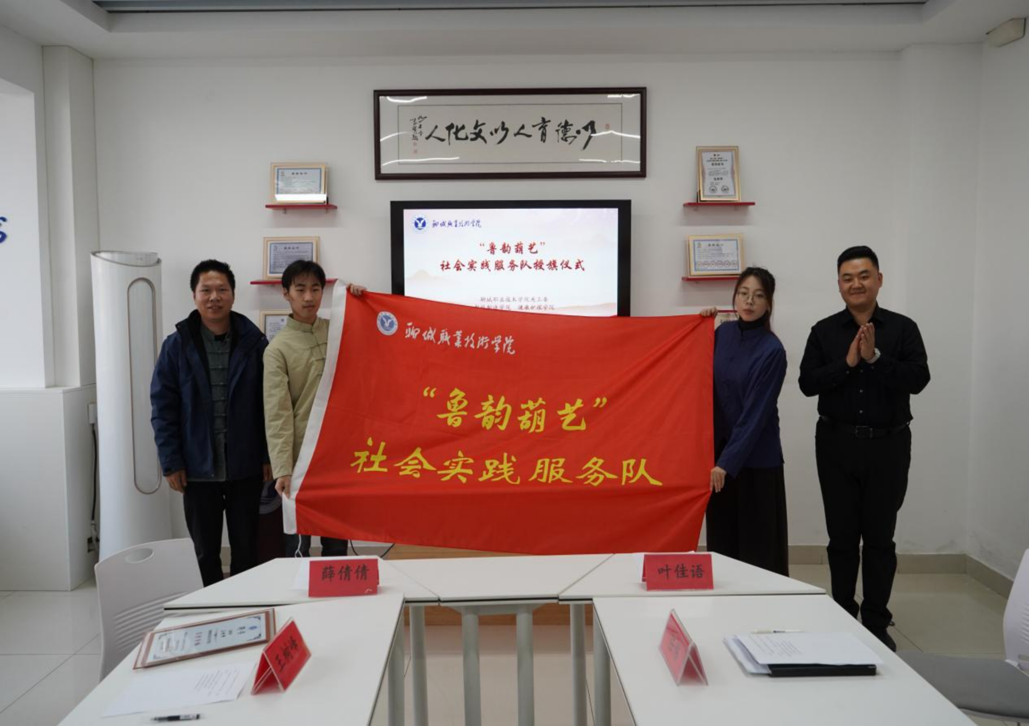 王树峰开展了葫芦雕刻现场教学与作品展示,带领师生近距离感受非遗技艺的魅力。师生们分组进行了葫芦雕刻实践体验,在动手创作中沉浸式体验了传统工艺的精妙与美育实践的乐趣。任伟为王树峰颁发了美育导师聘书。张博文、王树峰共同为“鲁韵葫艺”社会实践服务队授旗,叶佳语现场发布了《“匠心传艺·葫绘青春”美育传承计划》,标志着我校首个以非遗葫芦雕刻为核心内容的学生实践项目正式启动。王树峰表示,将积极投身校园美育工作,助力青年一代了解非遗、热爱非遗、传承非遗。