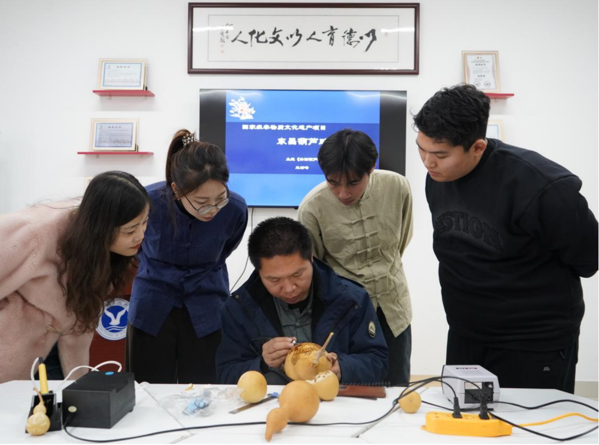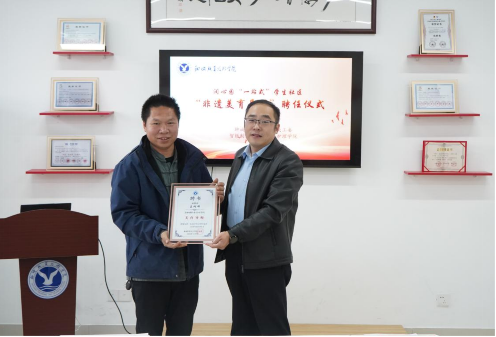 为深化中华优秀传统文化与校园美育深度融合,增强师生文化自信与审美素养,12月9日,王树峰美育导师聘任仪式暨非遗葫芦美育项目发布活动在“润心园”一站式学生社区成功举办。活动由聊城职业技术学院关心下一代工作委员会主办,智能制造学院关工委、健康护理学院关工委承办。国家级非物质文化遗产东昌葫芦雕刻技艺省级非遗传承人王树峰,智能制造学院党总支副书记任伟,校团委书记、健康护理学院党总支副书记张博文及师生代表30余人参加活动。智能制造学院团总支副书记刘丽敏主持。