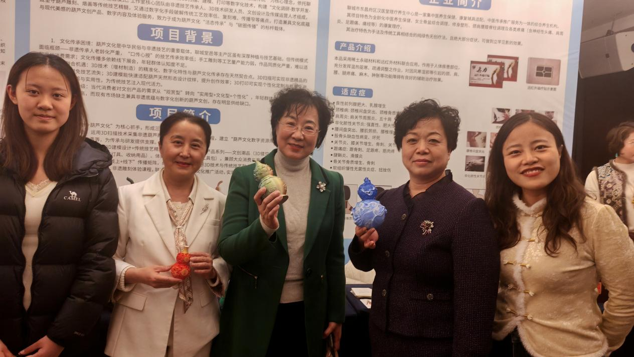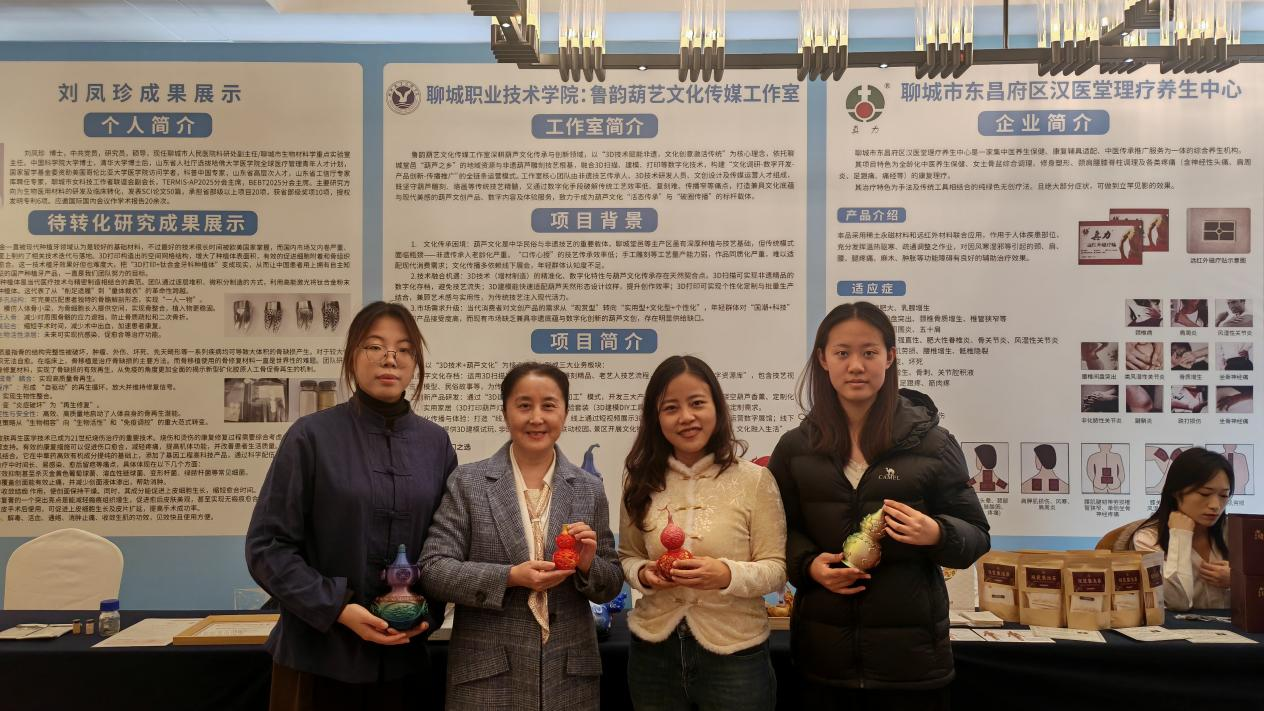 聊城职业技术学院作为唯一受邀的高校,有2个团队参展,其中,“鲁韵葫艺”社会实践服务队的参展作品传统葫芦精雕“连年有余”“福寿安康”等系列,尽显东昌葫芦雕刻非遗底蕴;融入智能制造专业理念的3D打印葫芦系列展品,复刻传统纹样之余附加科技符号,契合展会主题。