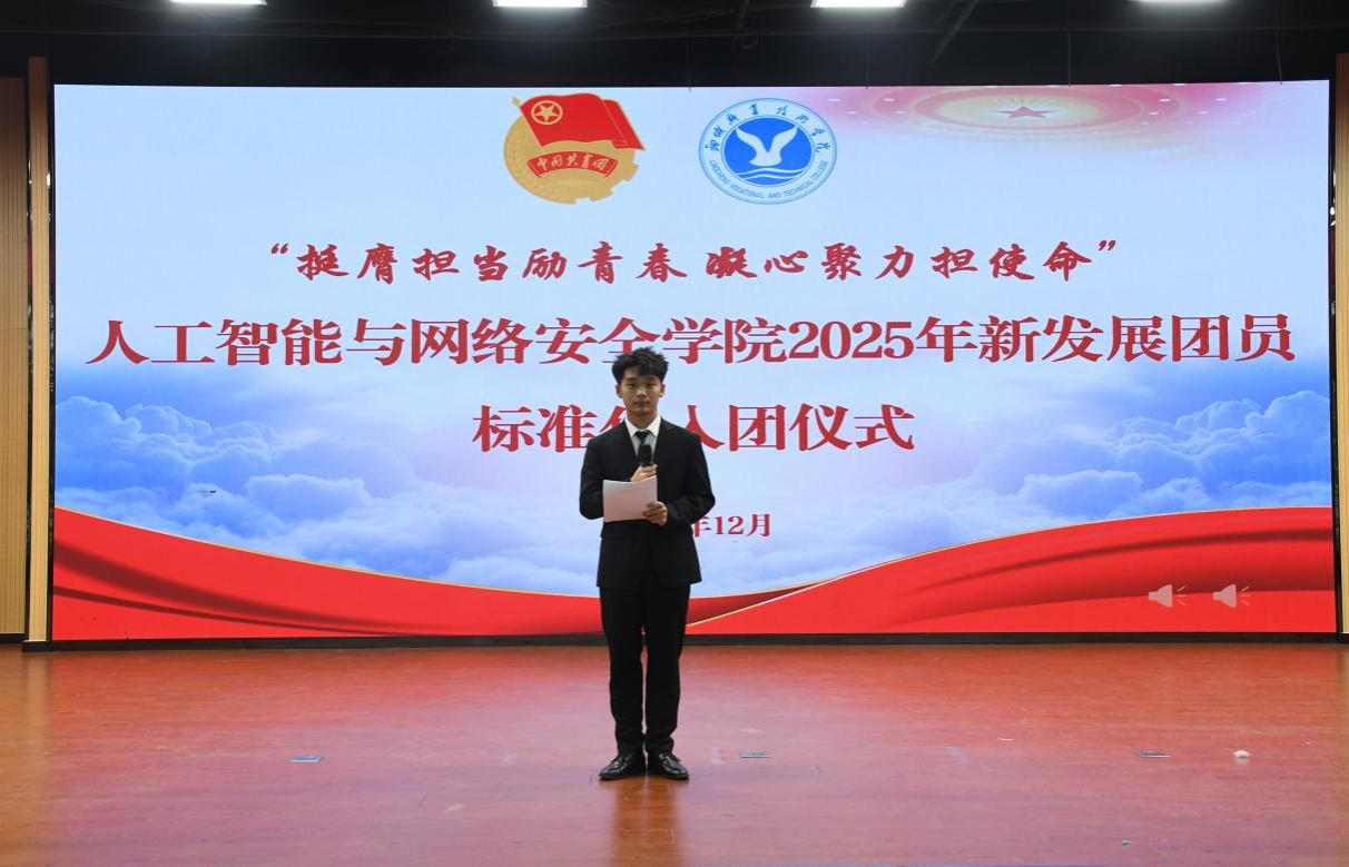 为强化团员青年的组织归属感与责任意识,近日,人工智能与网络安全学院举办“挺膺担当励青春 凝心聚力担使命”2025年新团员入团仪式。人工智能与网络安全学院党总支副书记魏伟、团总支书记王哲、辅导员老师及60余名新发展团员参加此次活动。