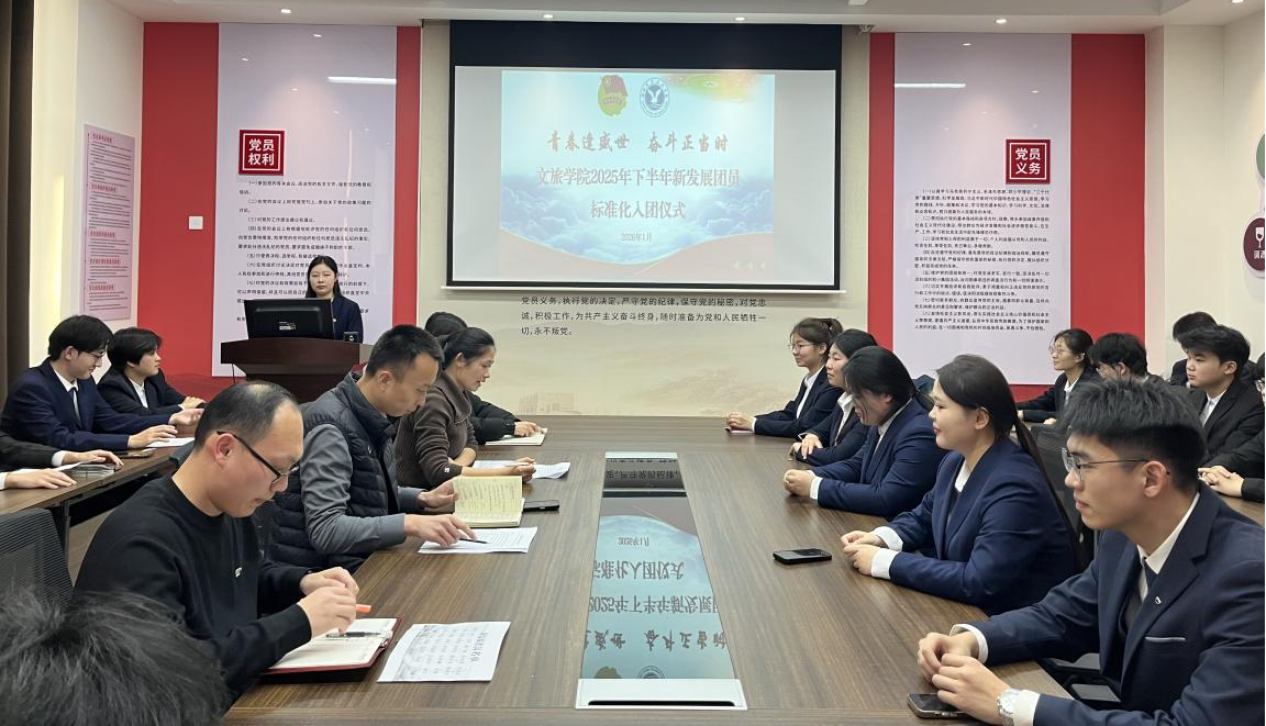 为深入贯彻习近平总书记关于青年工作的重要思想,规范团员发展程序,增强新团员的荣誉感与使命感,1月7日,文旅学院举行“青春逢盛世 奋斗正当时”2025年下半年新发展团员标准化入团仪式。文旅学院团总支副书记杜辉、全体辅导员、老团员代表及全体新团员共同见证这一青春时刻。