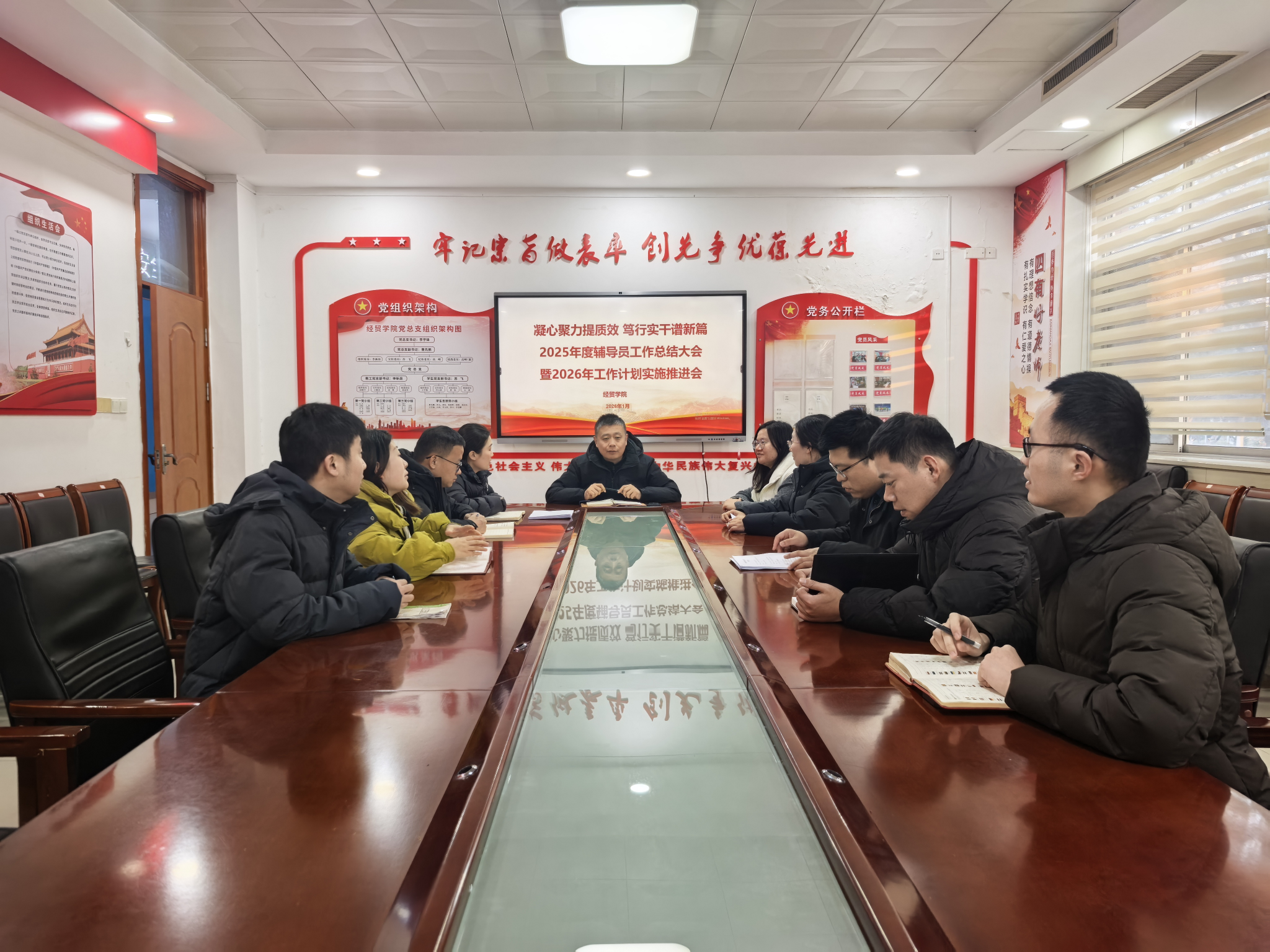 为全面总结2025年度学生工作成效,提炼育人经验,明晰发展方向,进一步加强辅导员队伍专业化、职业化建设,提升育人工作质效,1月22日,经贸学院召开2025年度辅导员工作总结大会暨2026年工作计划实施推进会。经贸学院党总支副书记曹先鹏、团总支书记苏飞及全体辅导员参会。