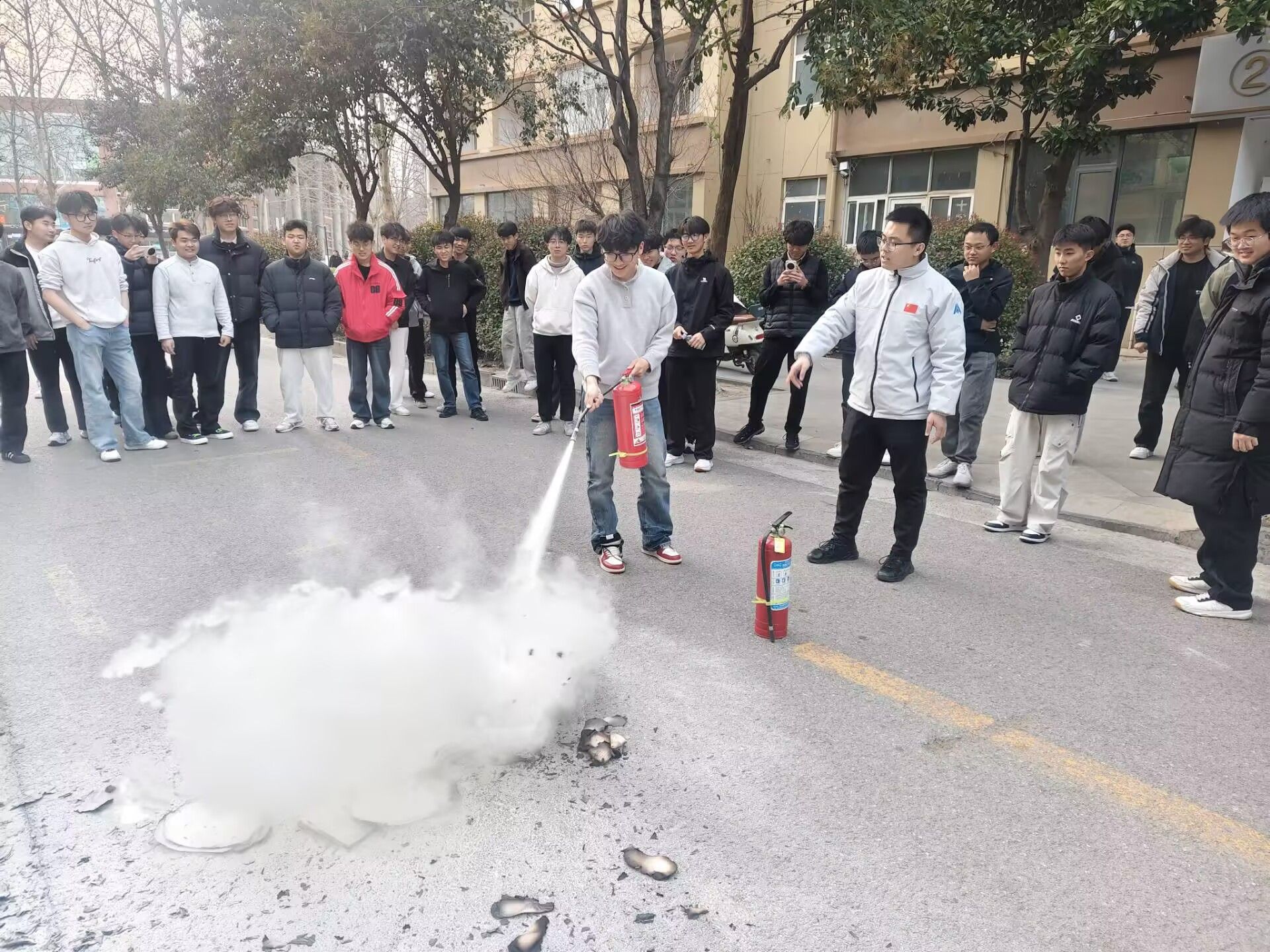 抵达集合点后,辅导员老师现场演示了灭火器“提、拔、握、压”四步操作法,并请学生代表上前亲自动手实操,让大家在实践中掌握初期火灾扑救技能。随后,辅导员对本次演练进行全面总结,对同学们的积极参与和规范表现给予肯定,同时指出演练中的细节问题,要求大家将消防安全知识牢记于心、付诸于行。