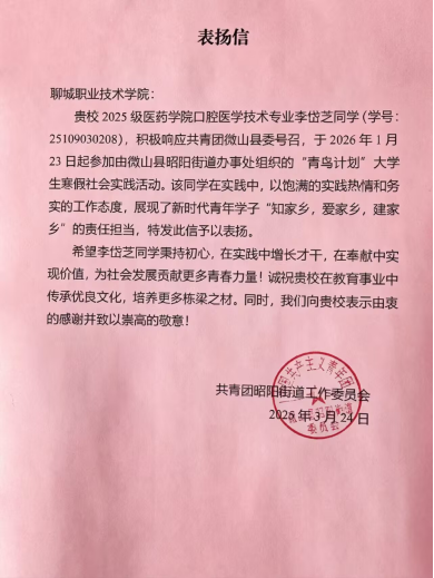 3月24日,共青团微山县昭阳街道工作委员会向医药学院发来表扬信,对2025级口腔医学技术2班李岱芝同学积极响应“青鸟计划”号召,投身家乡寒假社会实践、在基层一线践行志愿精神的突出表现,致以诚挚表扬与感谢。