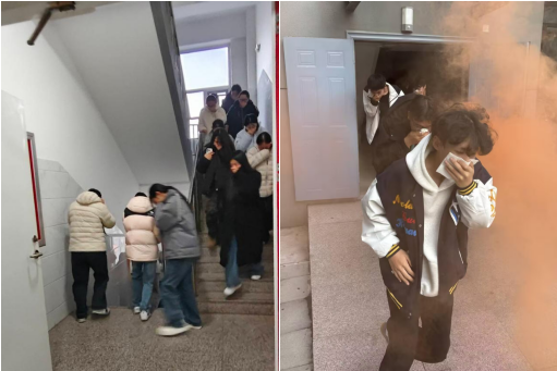 下午四点,模拟火情警报响起,演练正式开始。学院应急指挥组迅速启动预案,疏散引导、安全警戒、医疗保障等小组各司其职。师生们在引导员指引下,用湿毛巾捂住口鼻、低姿弯腰、靠右有序沿预定路线撤离,全程紧张高效,全部安全抵达集合点,各班完成人数清点上报。