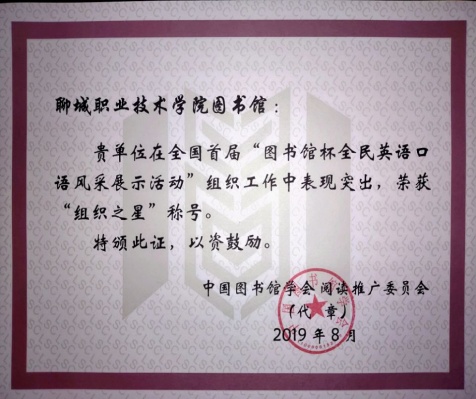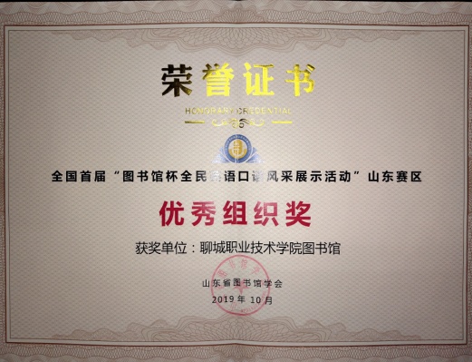 近日,聊城职业技术学院图书馆在以“图书馆,让世界倾听”为主题的全国首届“图书馆杯全民英语口语风采展示活动”中组织出色,获中国图书馆学会阅读推广委员会和山东省图书馆学会颁发的“优秀组织奖”荣誉证书。图书馆负责人王静颖等4人获得“优秀组织奖”、“组织之星”、馆员组“英语口语金星”和“英语口语达人”称号。