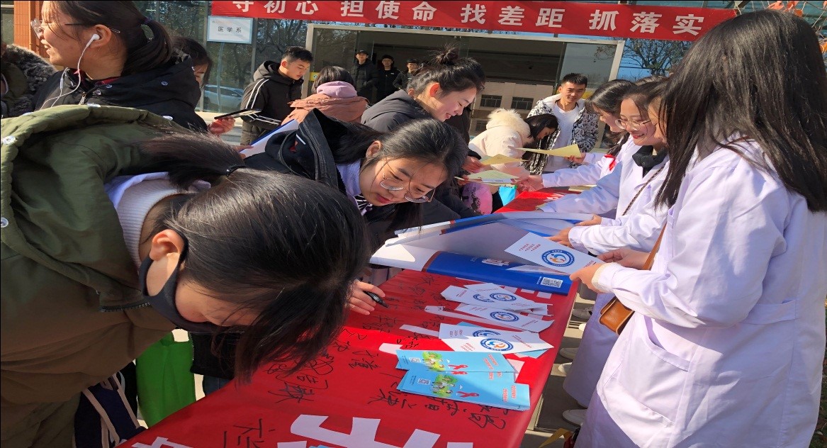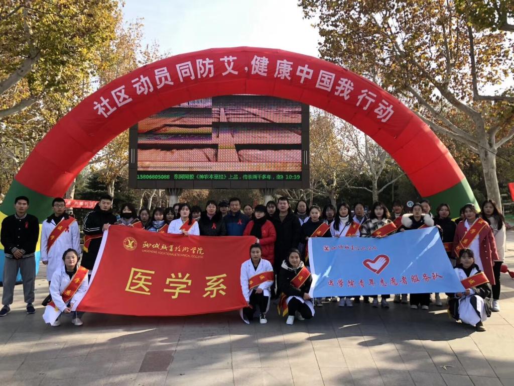 二是服务社会,参加聊城市“世界艾滋病日”防治宣传活动。12月1日是第32个“世界艾滋病日”,聊城市卫生健康委在健康主题公园举办艾滋病防治宣传活动。市人大常委会副主任孙菁,市卫生健康委党组成员、副主任侯森,农工党聊城市工委副主任赵素婷,市科协副主席潘云霞出席活动。医学系组织30余名青年志愿者参与活动。冒着严寒,志愿者们为广大群众发放宣传页等物品并进行健康知识讲解,向社会传递正确的艾滋病防治知识,倡导关爱,反对歧视,努力营造良好的防艾氛围。