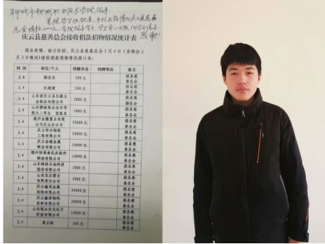 张凯良,是2018级市场营销班的一名学生,他时时刻刻关注着疫情,他认为疫情面前,人人都应该成为战“疫”者,虽然不能像“逆行者”们那样勇赴武汉,但想尽自己的一份力抗击疫情,向庆云县慈善总会捐款1000元,受到庆云县慈善总会的表扬。
