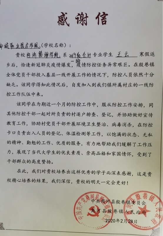 近日,我校收到中共商河县殷巷镇委员会、商河县殷巷镇人民政府发来的感谢信,对经济管理系2019级会计1班王云同学在参与当地疫情防控志愿服务工作中的付出和贡献进行表扬。